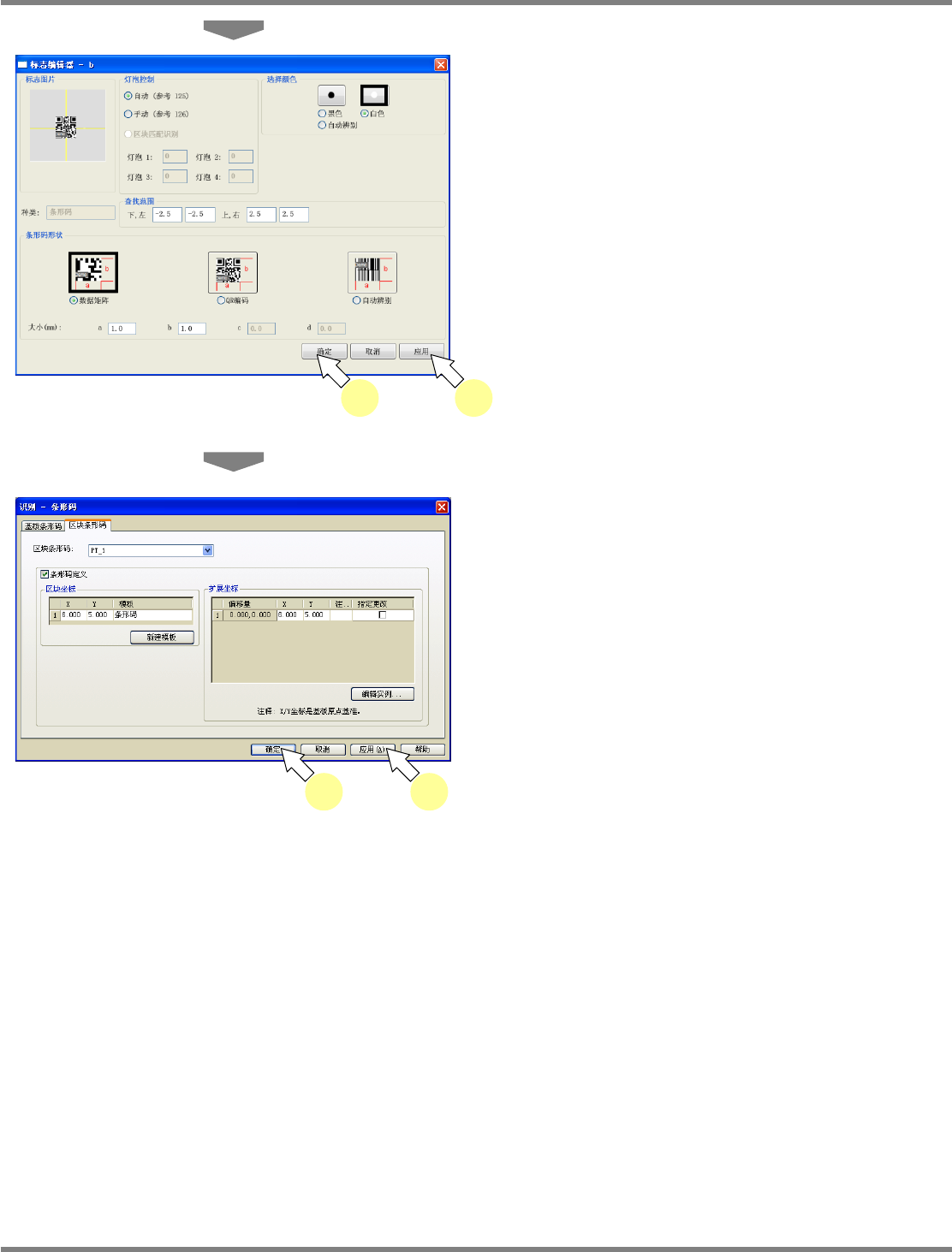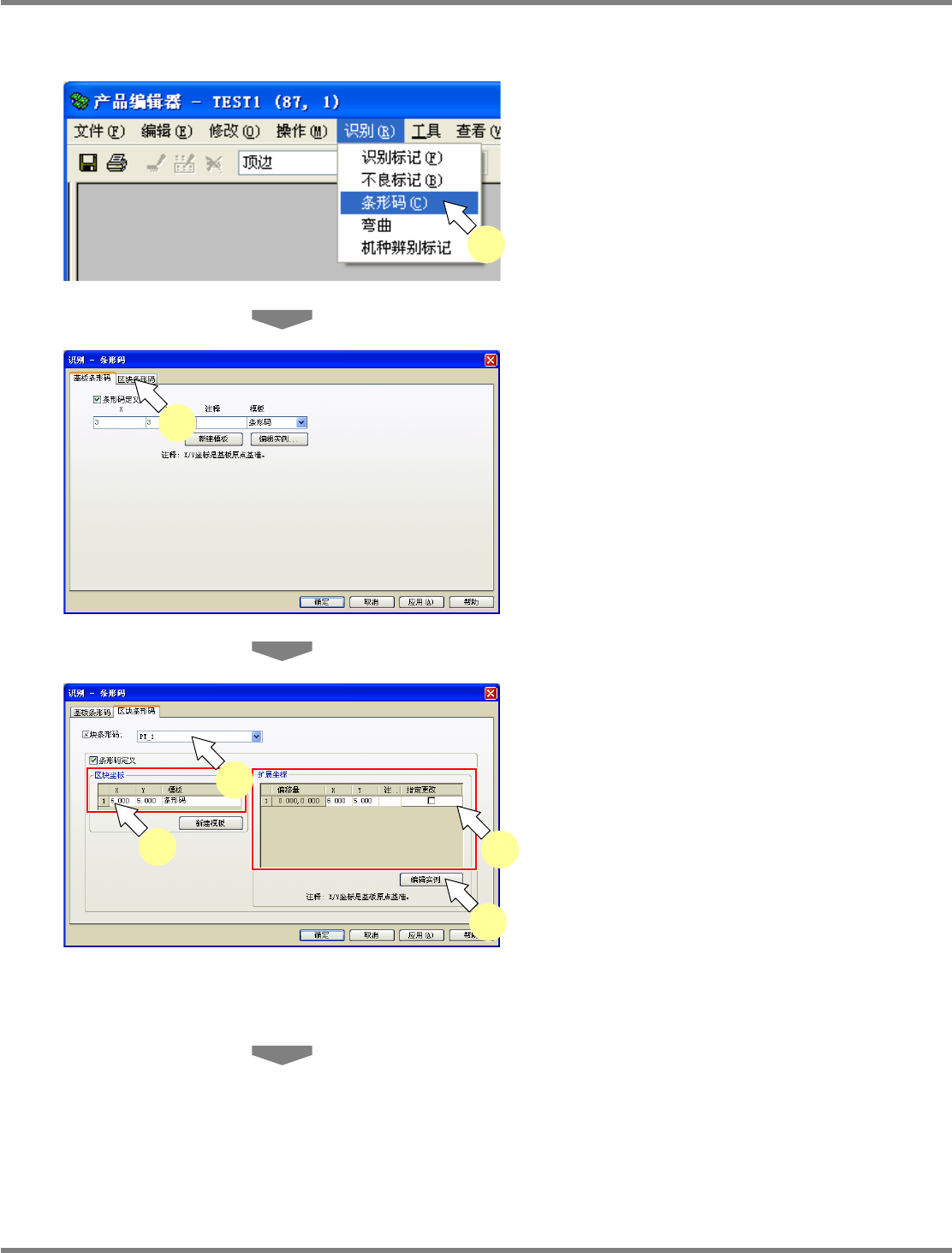 NPM-DGS 程序手册 5.8 PCB 编辑 EJS9AC-MB-05P-03 Page 5-195 ② 图形条形码的编辑 1 选择菜单栏的 [ 识别 ] [ 条形码 ] 。 显示出 < 识别 – 条形码 > 画面。 2 选择 [ 区块条形码 ] 标签。 3 选择要编辑图形条形码的图形类型。 4 若要变更图形条形码基准,进行变更。 5 选择要变更的图形条形码,进行变更。 6 进行标记编辑时,点击 [ 编辑实例 ] …