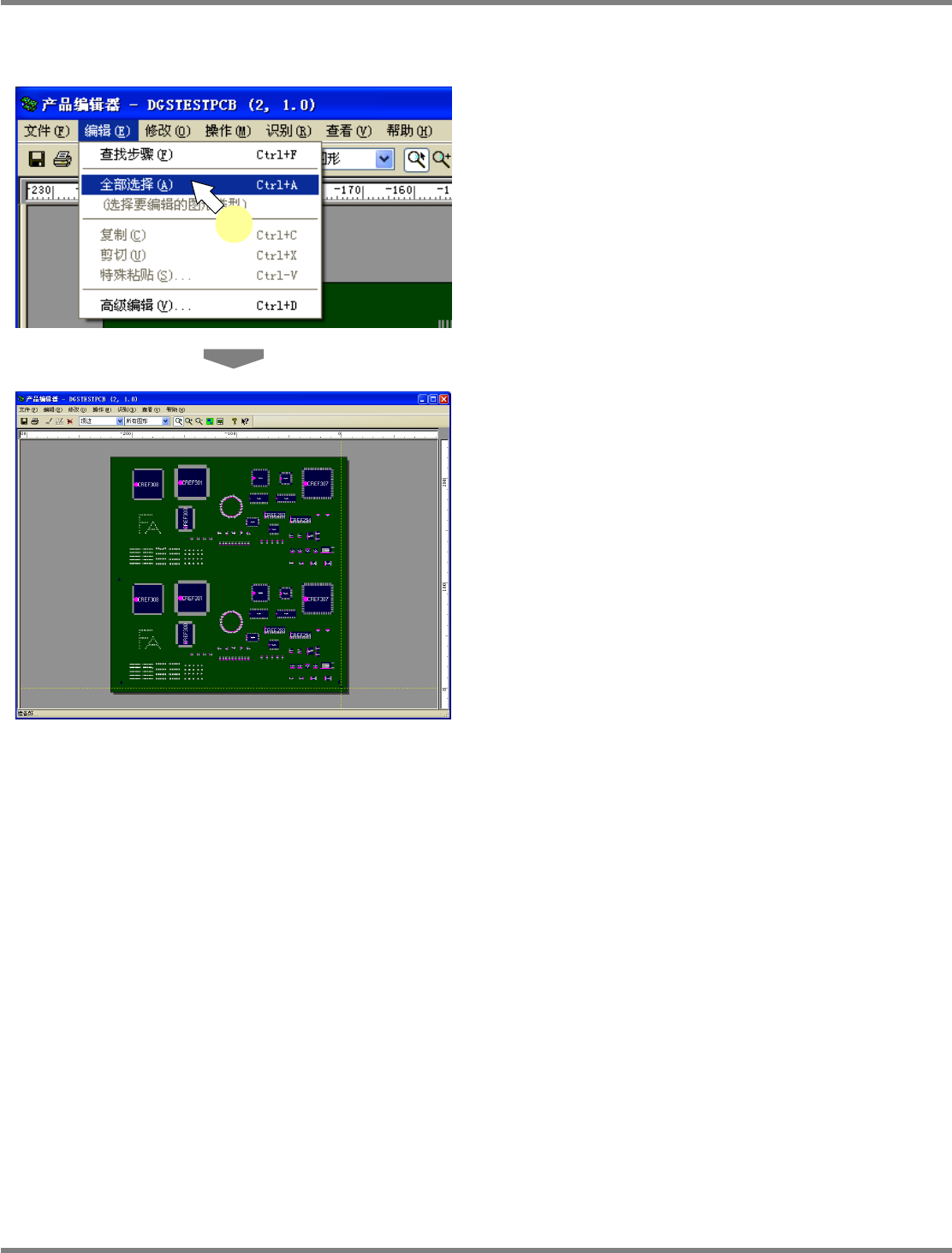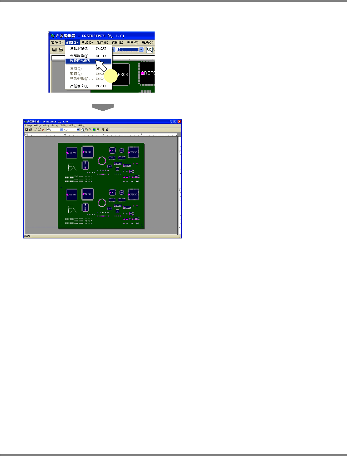 NPM-DGS 程序手册 5.8 PCB 编辑 EJS9AC-MB-05P-03 Page 5-227 图形位置的选择 1 选择菜单栏的 [ 编辑 ] [ 选择图形步 骤 ] ,或者在所选元件上弹出右击菜单, 选择 [ 选择图形类型的所有位置 ] 。 选择出所选图形类型的实装点、标记 。 Project050804S-1 8C00 1 Project050804S-1 9C00