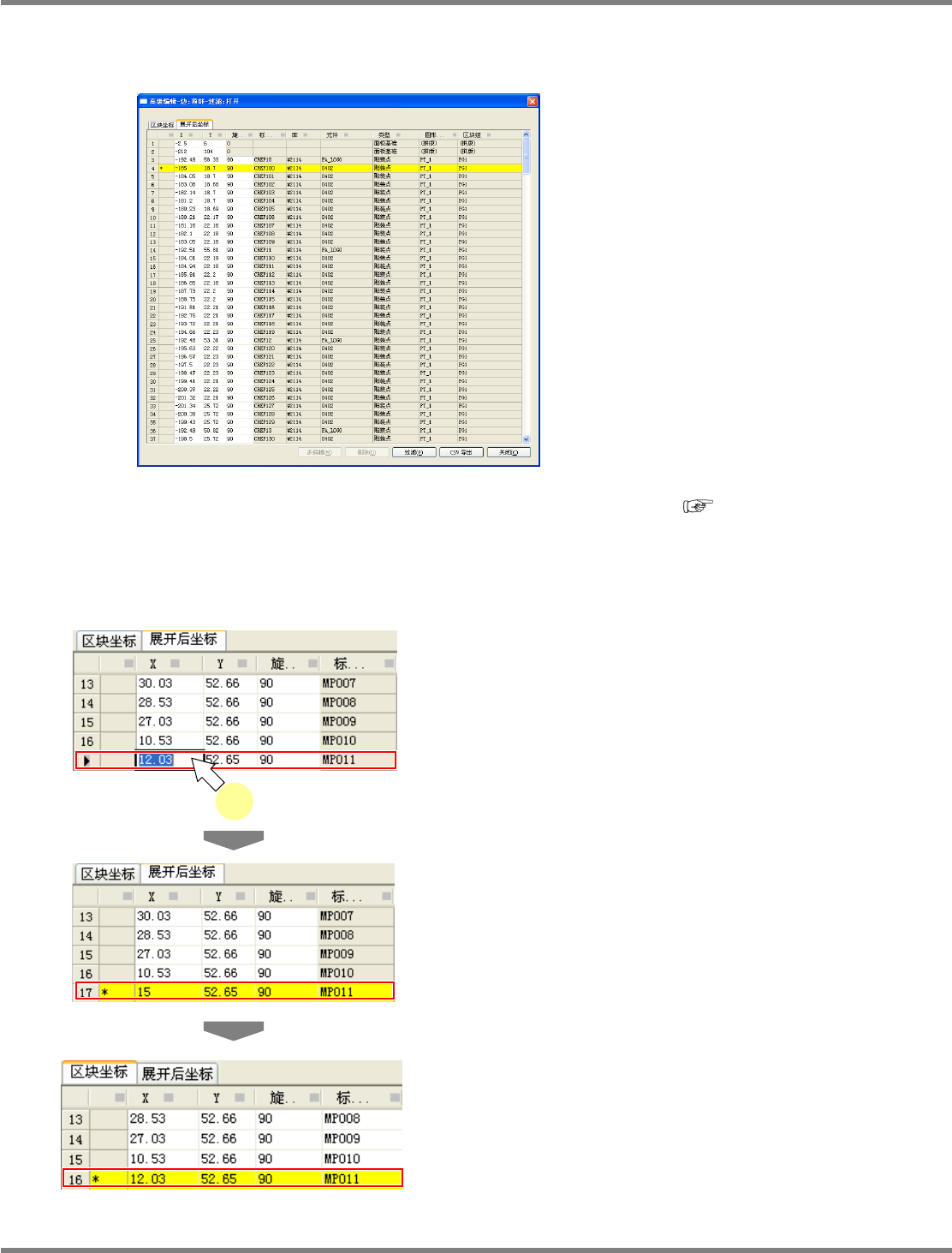 NPM-DGS 程序手册 5.8 PCB 编辑 Page 5-238 EJS9AC-MB-05P-03 高级编辑 展开后坐标选项 一览显示区块坐标的展开后数据,并 能够编辑啊各个项目。 显示项目以及按钮动作与区块坐标选 项相同。 ( 过滤的显示项目不同。 ) ( ‘5.8.4 实装点的编辑 ■高级编辑 区块坐标选项 ’) 如果坐标变更为与展开后坐标不同的 坐标, 行的颜色转为黄色す。 同时, [ 区块坐标 ] 选项的链接行 …