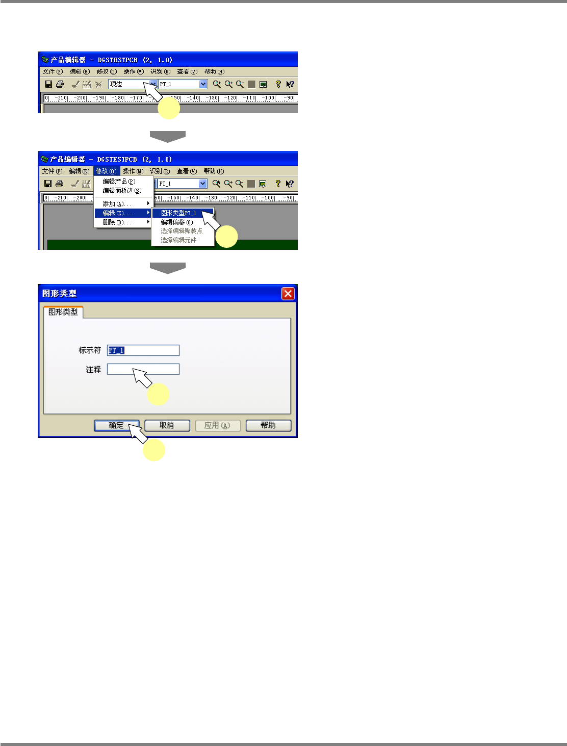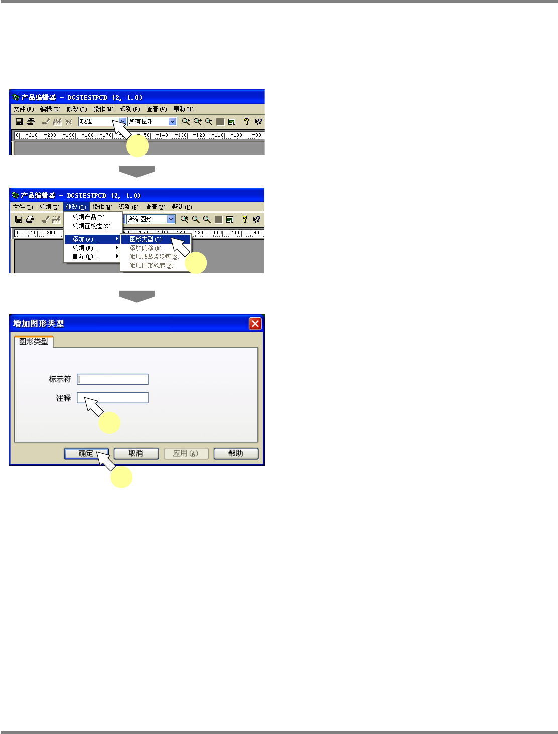 NPM-DGS 程序手册 5.8 PCB 编辑 Page 5-244 EJS9AC-MB-05P-03 5.8.6 图形类型 在 < 图形类型 > 画面上设定与图形类型有关的信息。 添加图形类型 1 选择基板的表里。 2 选择菜单栏的 [ 修改 ] [ 添加 ] [ 图形 类型 ] 。 显示出 < 增加图形类型 > 画面。 3 进行必要的设定。 4 点击 [ 确定 ] 。 Project05080…