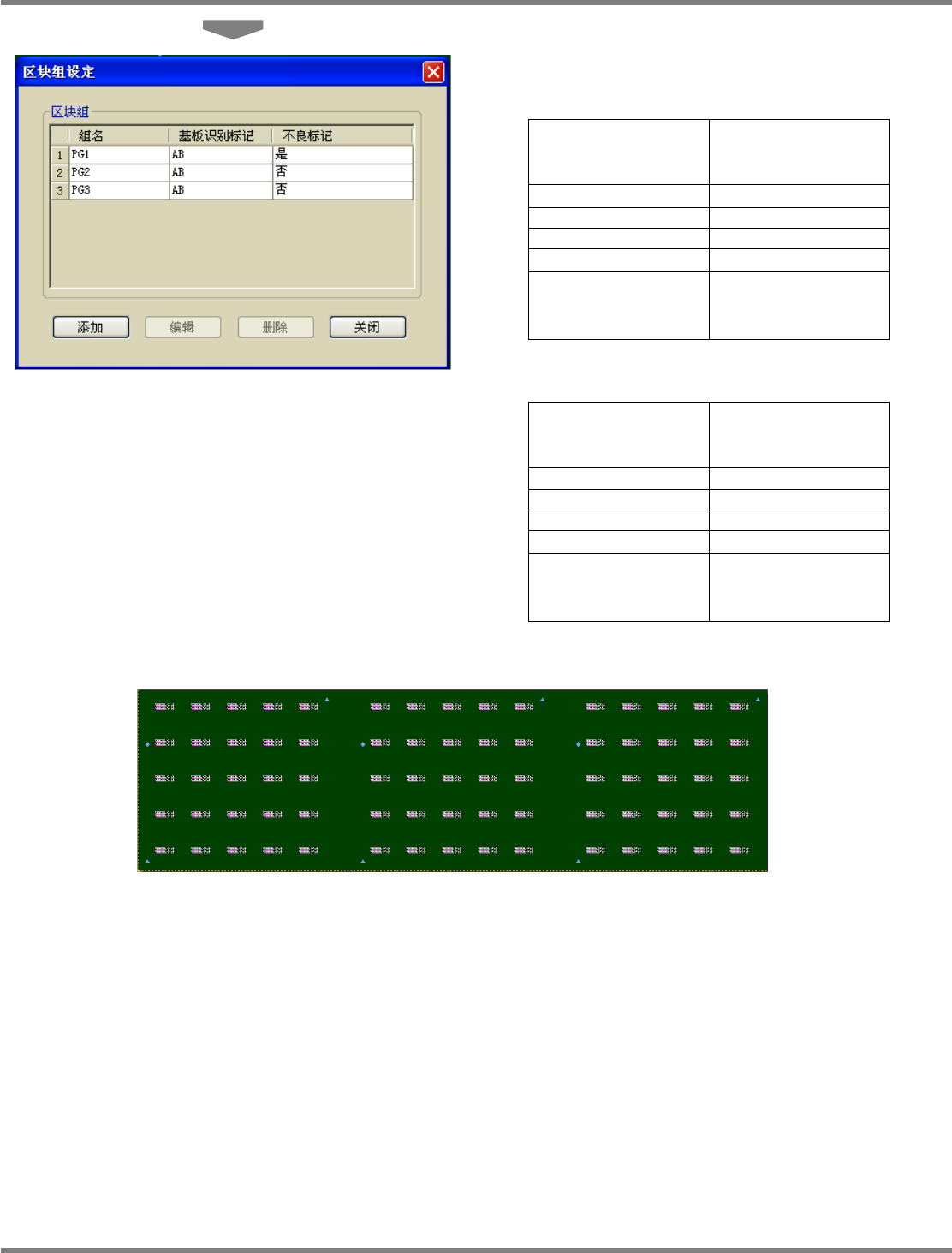 NPM-DGS 程序手册 5.8 PCB 编辑 EJS9AC-MB-05P-03 Page 5-267 ① 图形组识别标记标签 通过图形组识别标记标签对图形组识 别标记进行定义。 设定项目 项目 说明 ‘ 组名 ’ 图形组的组名称。 识别标记与不良标记共享本名称。 ‘ 识别标记定义 ’ 使用图形组识别标记的情况下要打勾 。 ‘X’ 设定图形组识别标记的 X 坐标。 ‘Y’ 设定图形组识别标记的 Y 坐标。 ‘ 注释 ’ 输入与图形组…