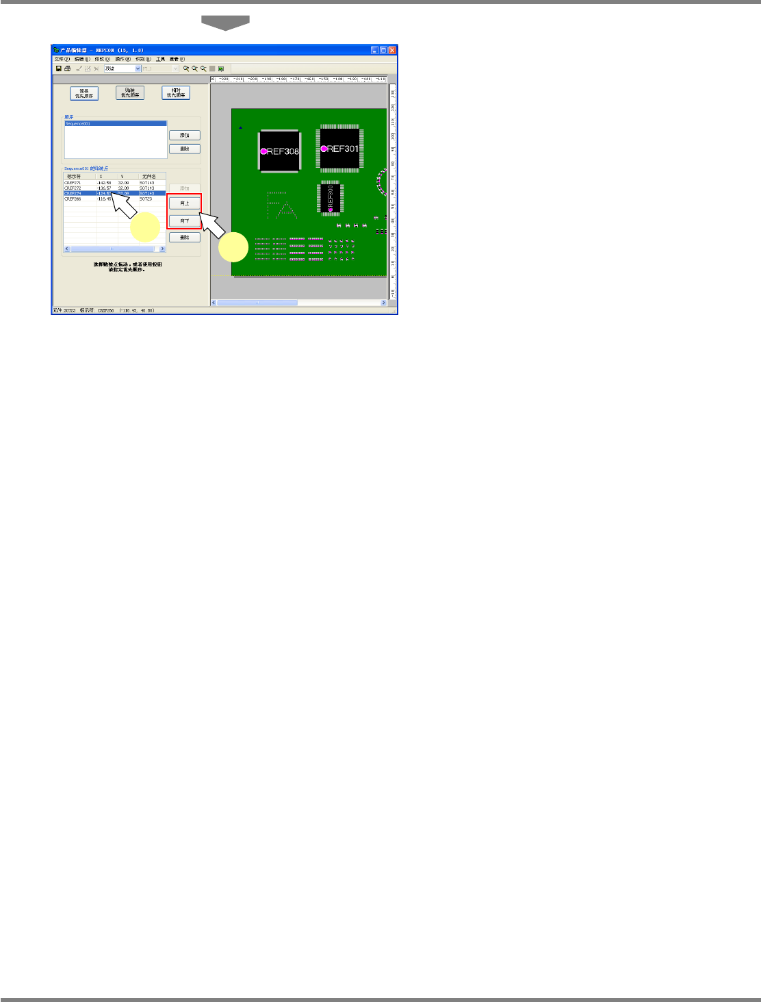 NPM-DGS 程序手册 5.8 PCB 编辑 Page 5-278 EJS9AC-MB-05P-03 贴装优先顺序的添加 1 选择菜单栏的 [ 查看 ] [ 实装优先顺 序 ] 。 显示出实装优先顺序画面。 2 点击 [ 贴装优先顺序 ] 。 3 点击 [ 添加 ] 。 4 在 PCB 编辑器上,选择要指定优先顺 序的元件。 5 将所选择的元件拖放到一览表中, 或者 点击 [ 添加 ] ,并添加到一览表中。 所选元件图…