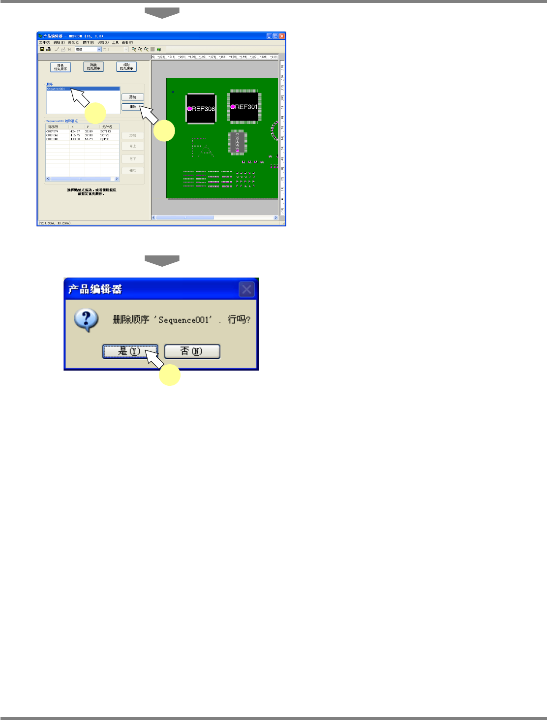 NPM-DGS 程序手册 5.8 PCB 编辑 EJS9AC-MB-05P-03 Page 5-283 3 在一览表中选择要删除的序列。 4 点击 [ 删除 ] 。 显示出确认画面。 5 点击 [ 确定 ] 。 在序列一览表中所选的序列将被删除 。 Project050809S-2 0C02 3 4 Project050809S-2 2C00 5
