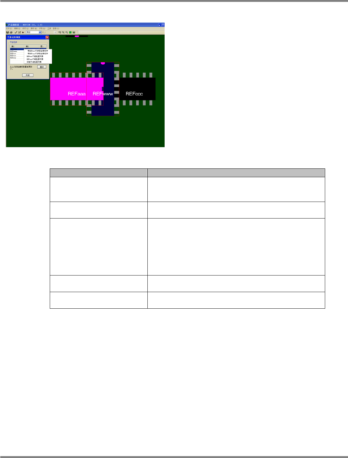 NPM-DGS 程序手册 5.8 PCB 编辑 Page 5-294 EJS9AC-MB-05P-03 ② 干涉元件的确认与编辑 1 选择干涉元件列表中的行后右击。 右击菜单 项目 说明 [ 和 REFwww 干涉的全部元件 ] 显示与实装点 ‘REFwww ( 第 1 实装点 )’ 干涉的所有实装点的框, 通过迅速放大以显示所有对象实装点 。 对实装点 REFwww 及发生干涉的所有实装点用不同颜 色显示框。 [ 和 REFaaa…