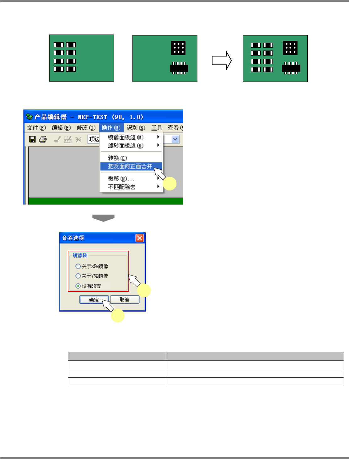 NPM-DGS 程序手册 5.8 PCB 编辑 EJS9AC-MB-05P-03 Page 5-303 5.8.17 背面数据的合并 这是将正反基板数据变更为配置在正 反相同面上的基板数据的功能。 1 选择菜单栏的 [ 操作 ] [ 把反面向正面 合并 ] 。 显示 < 合并选项 > 画面。 2 选择适当的实装点的反转方法。 3 点击 [OK] 。 关闭 < 合并选项 > 画面后,背面数据将被合并到 …