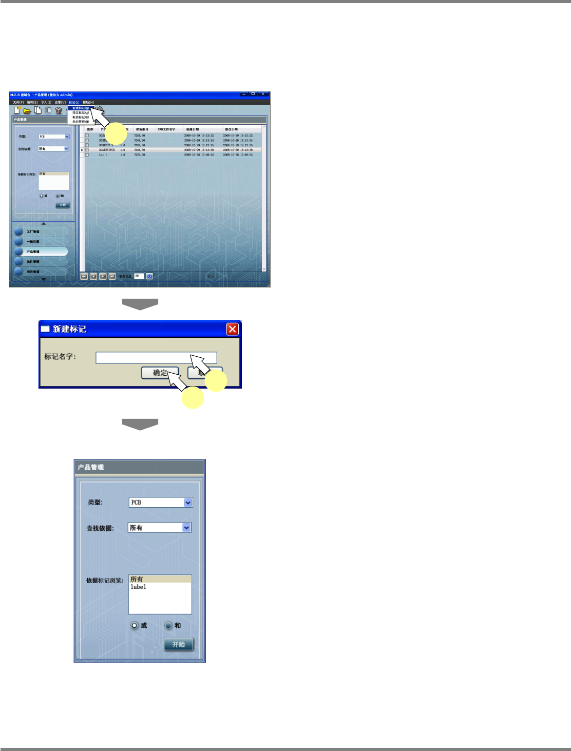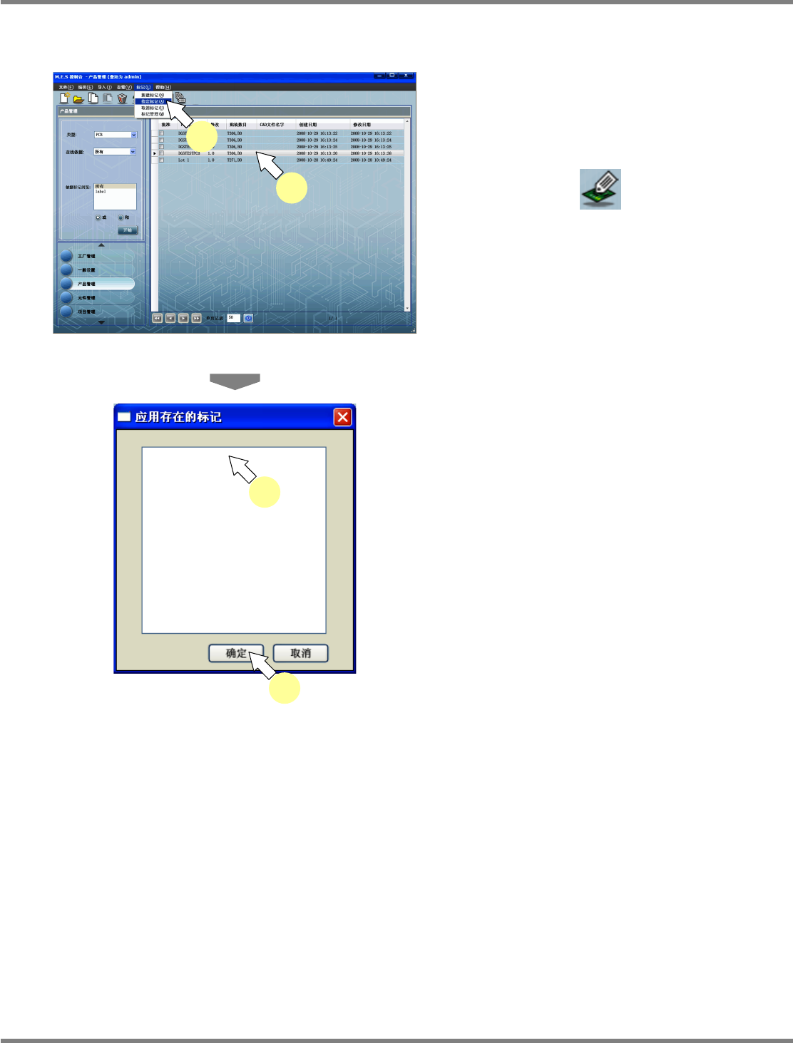 NPM-DGS 程序手册 5.9 PCB 检索 Page 5-306 EJS9AC-MB-05P-03 5.9.2 标签的检索 给每个 PCB 配上标签,进行标签检索。 标签的新建 1 选择菜单栏的 [ 标记 ] [ 新建标记 ] ,或 者在 PCB 一览表上弹出右击菜单,选 择 [ 新建标记 ] 。 显示出 < 新建标记 > 画面。 2 输入 ‘ 标记名字 ’ 。 输入的标签名已登录的情况下,显示 出确认对…