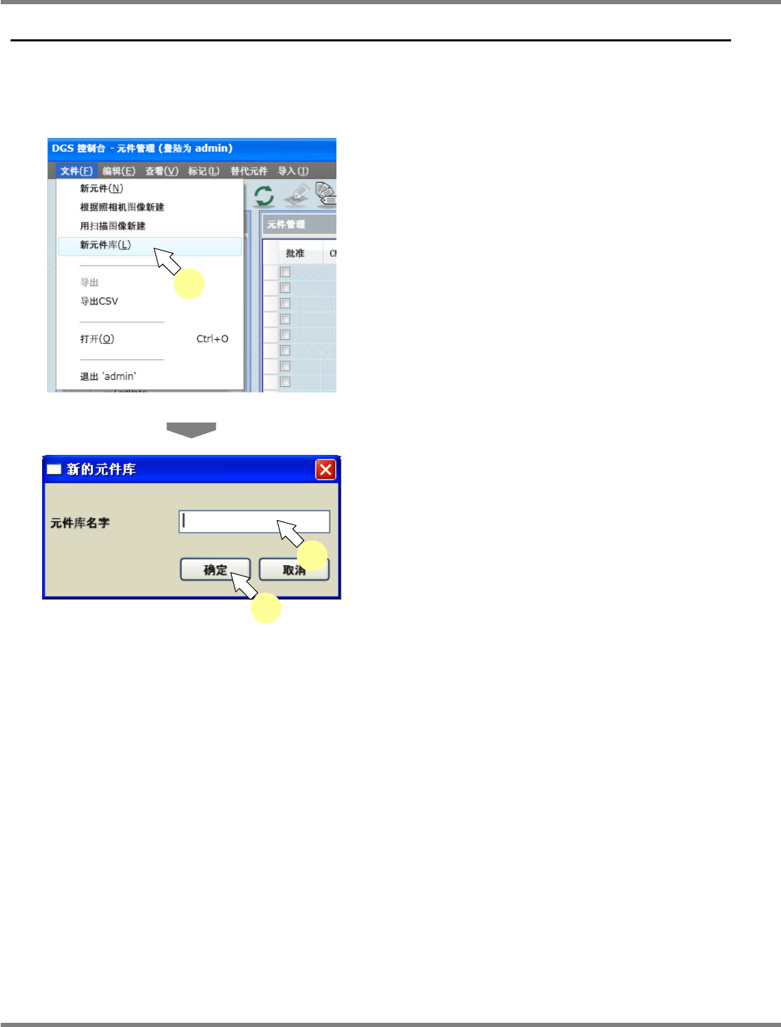 NPM-DGS 程序手册 6.2 添加新的元件库 Page 6-10 EJS9AC-MB-06P-02 6.2 添加新的元件库 通过元件库可进行元件数据的分类和 管理。 定义新的元件库 1 选择菜单栏的 [ 文件 ] [ 新元件库 ] 。 将会显示 < 新的元件库 > 。 2 输入编制的元件库名字。 不能使用下述文字。 % ” 空白 以 PT200 规则为基准。 3 点击 [ 确定 ] 。 新元件库将…