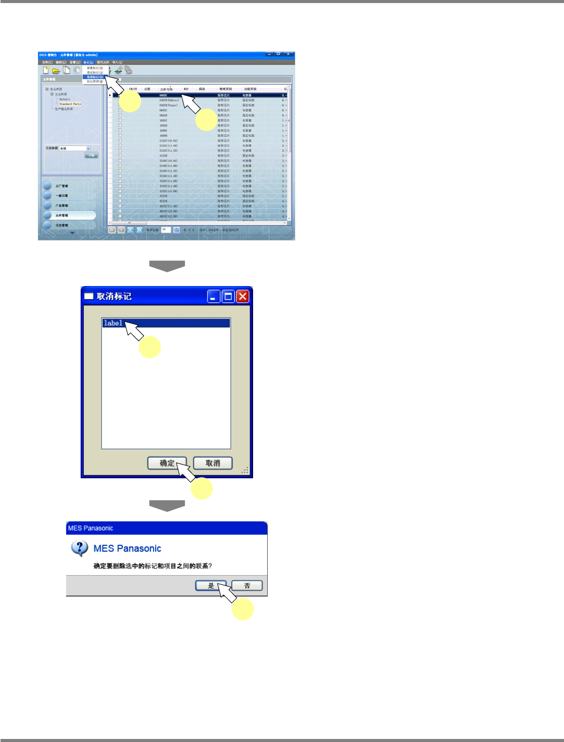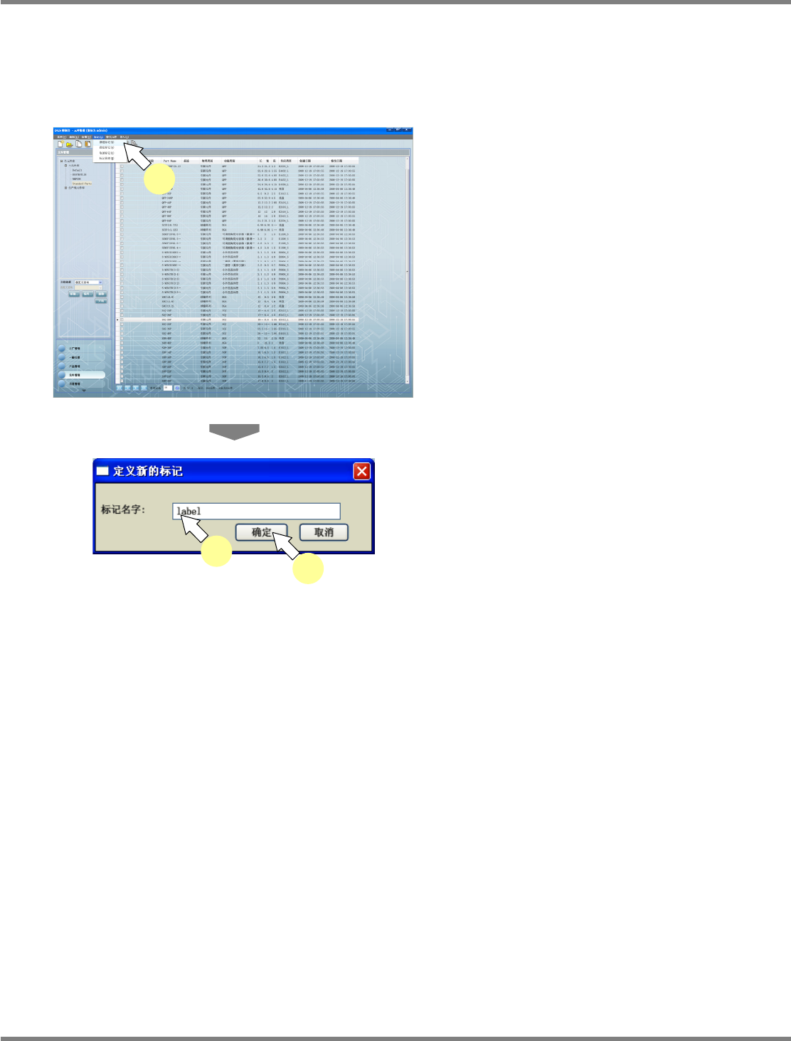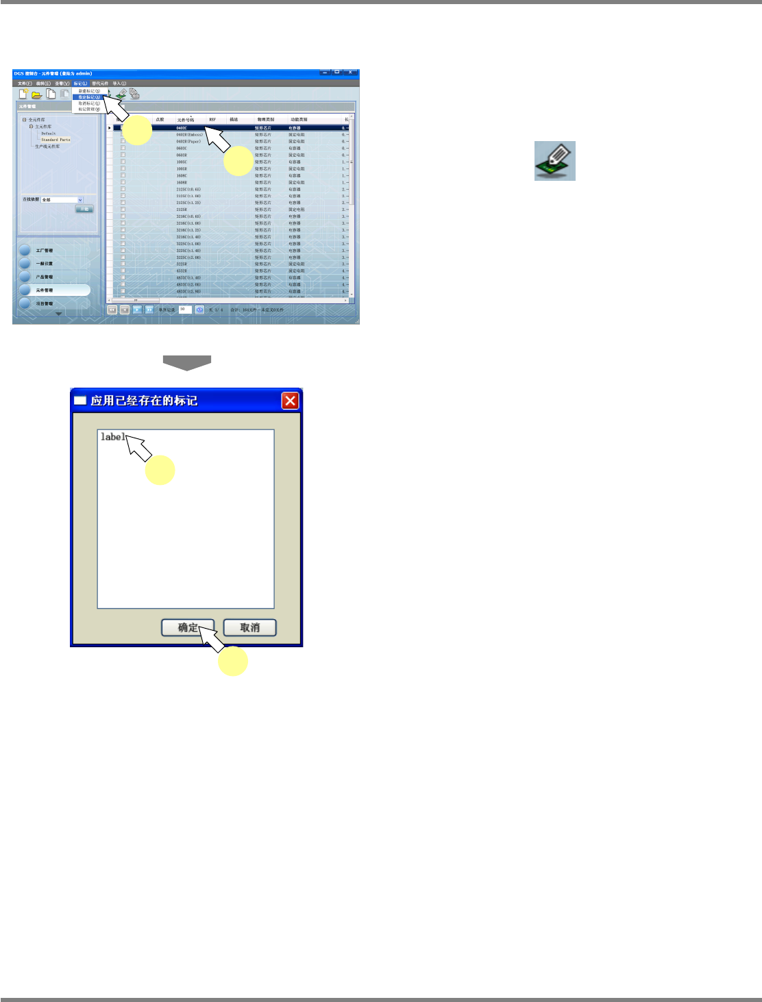NPM-DGS 程序手册 6.3 元件检索 Page 6-20 EJS9AC-MB-06P-02 给元件指定标记 1 在元件一览中选择元件。 2 选择菜单栏的 [ 标记 ] [ 指定标记 ] ,或 点击工具栏的 ( 指定标记 ) , 或在 所选元件上弹出右击菜单, 选择 [ 指定标 记 ] 。 显示出 < 应用己经存在的标记 > 画面。 3 选择标签。 4 点击 [ 确定 ] 。 所选元件上将指定标记。 Pa…