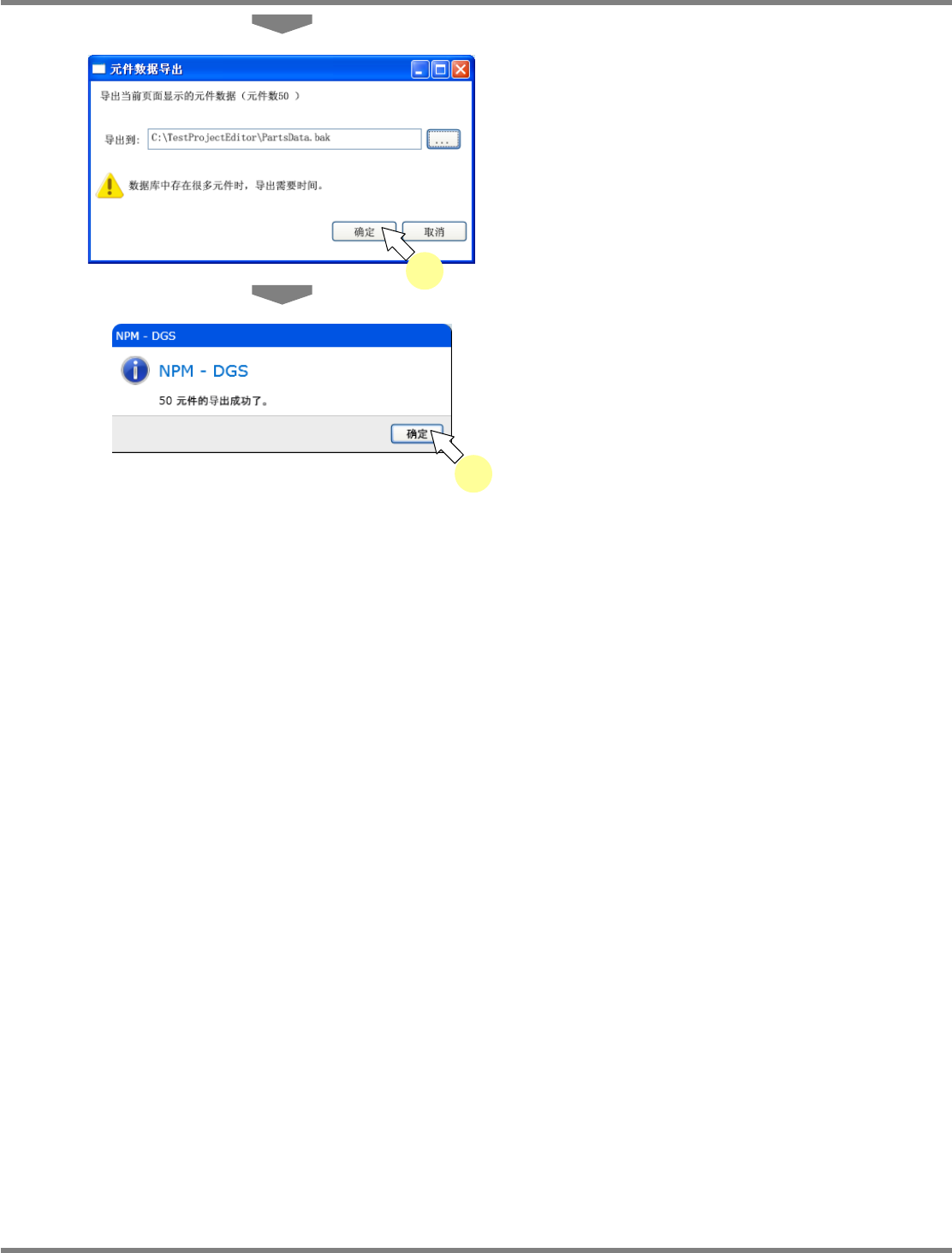 NPM-DGS 程序手册 6.4 元件的导入、导出 EJS9AC-MB-06P-02 Page 6-35 4 点击 [ 确定 ] 。 显示出确认画面。 5 点击 [ 确定 ] 。 Parts060400S-2 6C01 4 Parts060400S-2 7C01 5