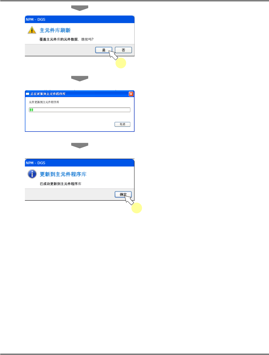 NPM-DGS 程序手册 6.4 元件的导入、导出 Page 6-38 EJS9AC-MB-06P-02 对生产线内的每个元件程序库进行更新时 1 从程序库的树状菜单显示区域中选择 生产线后, 单击右击菜单上的 [ 更新到主 元件程序库 ] 。 将显示 < 更新到主元件程序库 > 画面。 在这之后, 请按照与 ‘ ■对每个生产线进行更新时 ’ 相同 的步骤执行更新。 对每个元件进行更新时 1 选择元件后,单击右击…