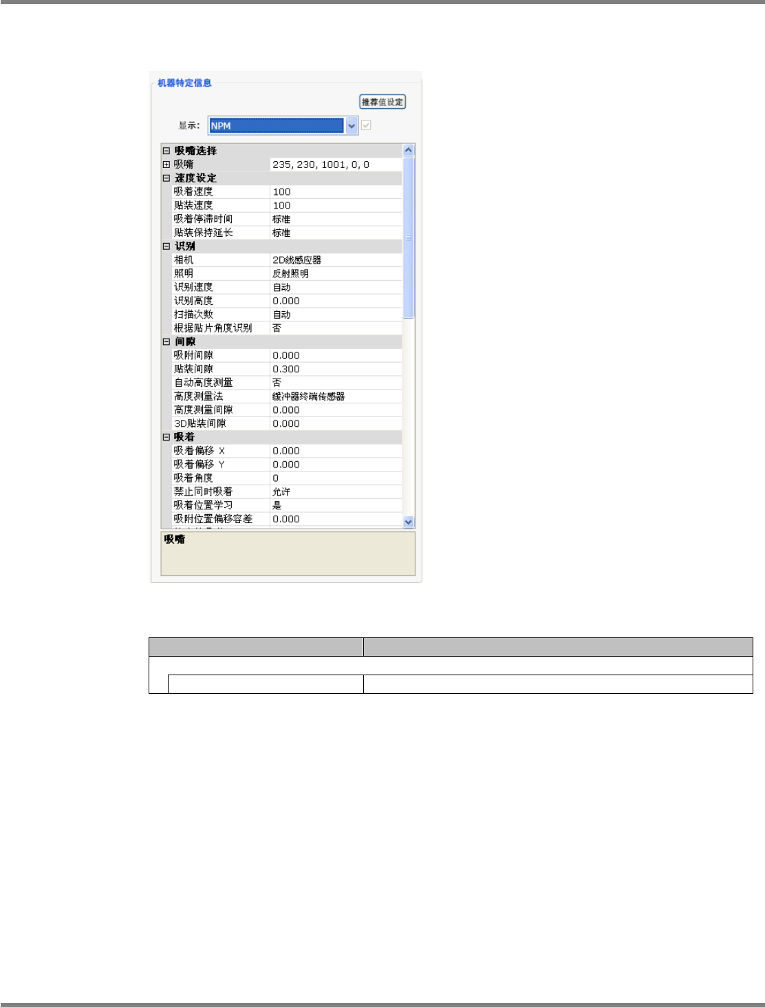 NPM-DGS 程序手册 6.5 添加新的元件 EJS9AC-MB-06P-02 Page 6-55 ④ 机器特定信息 通过机器特定信息画面设定机器动作 的有关信息。 设定项目 项目 说明 ‘ 吸嘴选择 ’ ‘ 吸嘴 ’ 设定要使用的吸嘴种类。最多可设 定 5 个。 Parts060603S-1 1C03