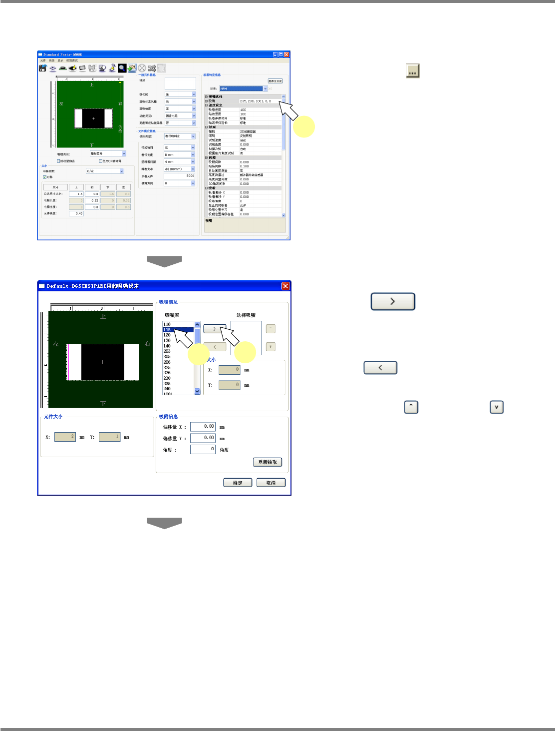 NPM-DGS 程序手册 6.5 添加新的元件 EJS9AC-MB-06P-02 Page 6-73 设定有关元件的吸嘴信息 1 点击 ‘ 机器特定信息 ’ 的 ‘ 吸嘴参考 ’ 右边 的吸嘴检查 。 显示出吸嘴构成画面。 2 从 ‘ 吸嘴库 ’ 中选择候选吸嘴,点击向右 箭头 。 在选择吸嘴中显示所选择的吸嘴。 解除选择吸嘴时,请选择设定吸嘴, 点击向左 箭头 。 变更选择吸嘴的候选顺序时, 请选择设定吸嘴, 点击…