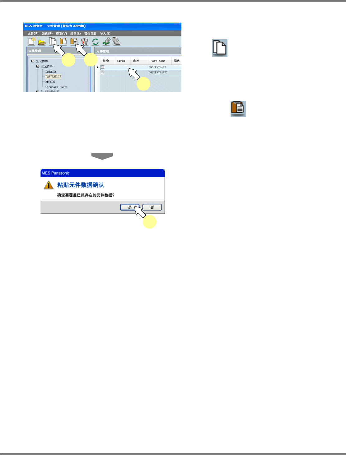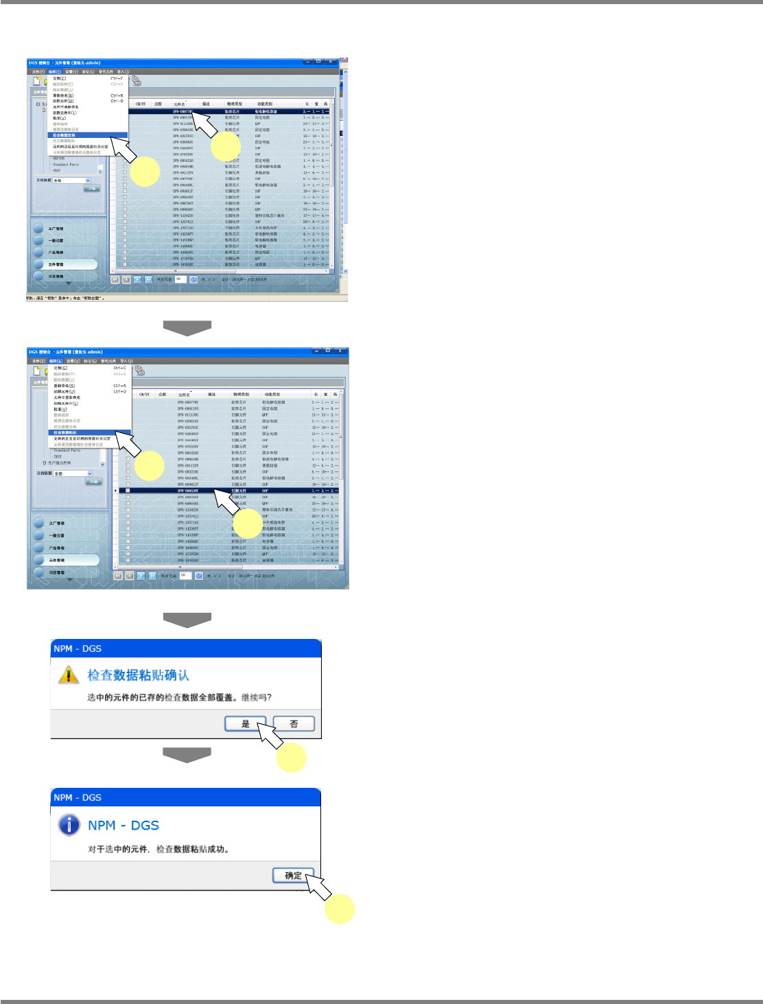 NPM-DGS 程序手册 6.6 复制元件 EJS9AC-MB-06P-02 Page 6-113 6.6.2 复制到现有的元件数据中 1 选择要复制的元件, 然后选择菜单栏的 [ 编辑 ] [ 复制 ] ,或者点击工具栏的 ( 复制 ) , 或者在要复制的元件上弹 出右击菜单,选择 [ 复制 ] 。 2 选择复制地点的元件, 然后选择菜单栏 的 [ 编辑 ] [ 粘贴数据 ] ,或者点击工具 栏的 ( 粘贴 ( 覆盖 )) ,…