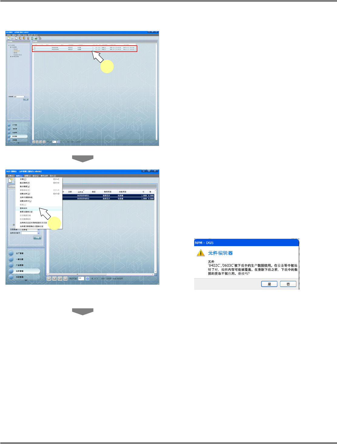 NPM-DGS 程序手册 6.7 现有元件的编辑 Page 6-120 EJS9AC-MB-06P-02 整体编辑 1 选择要进行整体编辑的元件。 进行整体编辑时,要选择 2 个以上的元件。 选择多个元件时, 一边按住 [Shift] 键, 或者 [Ctrl] 键,一边选择元件。 2 选择菜单栏的 [ 编辑 ] [ 整体编辑 ] ,或 者在所选元件上弹出右击菜单, 点击 [ 整 体编辑 ] 。 显示出 < 整体…