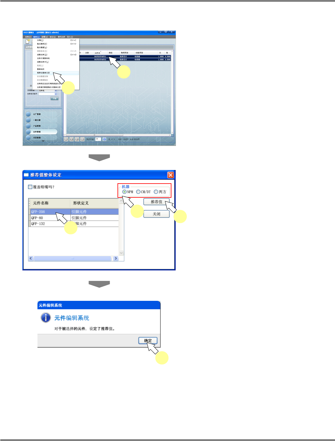 NPM-DGS 程序手册 6.7 现有元件的编辑 EJS9AC-MB-06P-02 Page 6-123 智能默认 ( 多个元件的情况下 ) 1 选择将机器特定信息变更为推荐值的 元件。 2 选择菜单栏的 [ 编辑 ] [ 推荐值整体设 定 ] ,或者在所选元件上弹出右击菜单, 选择 [ 推荐值整体设定 ] 。 显示出 < 推荐值整体设定 > 画面。 3 选择设定为推荐值的元件。 4 从 ‘NPM’ 、 ‘CM/…