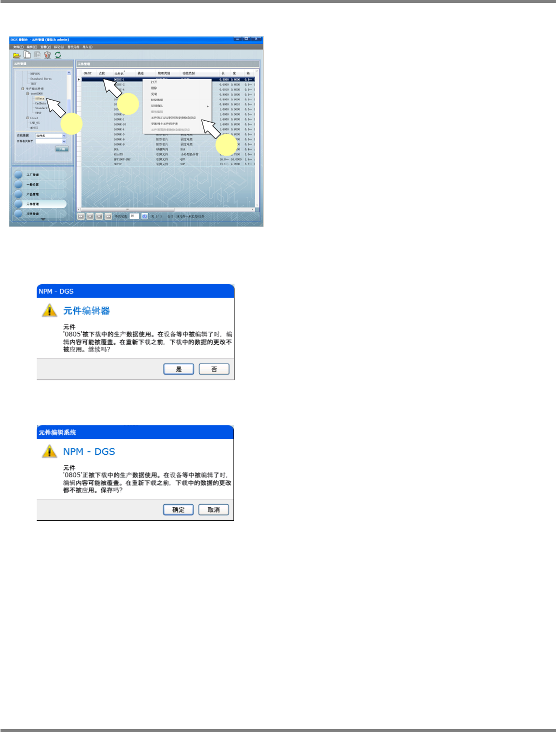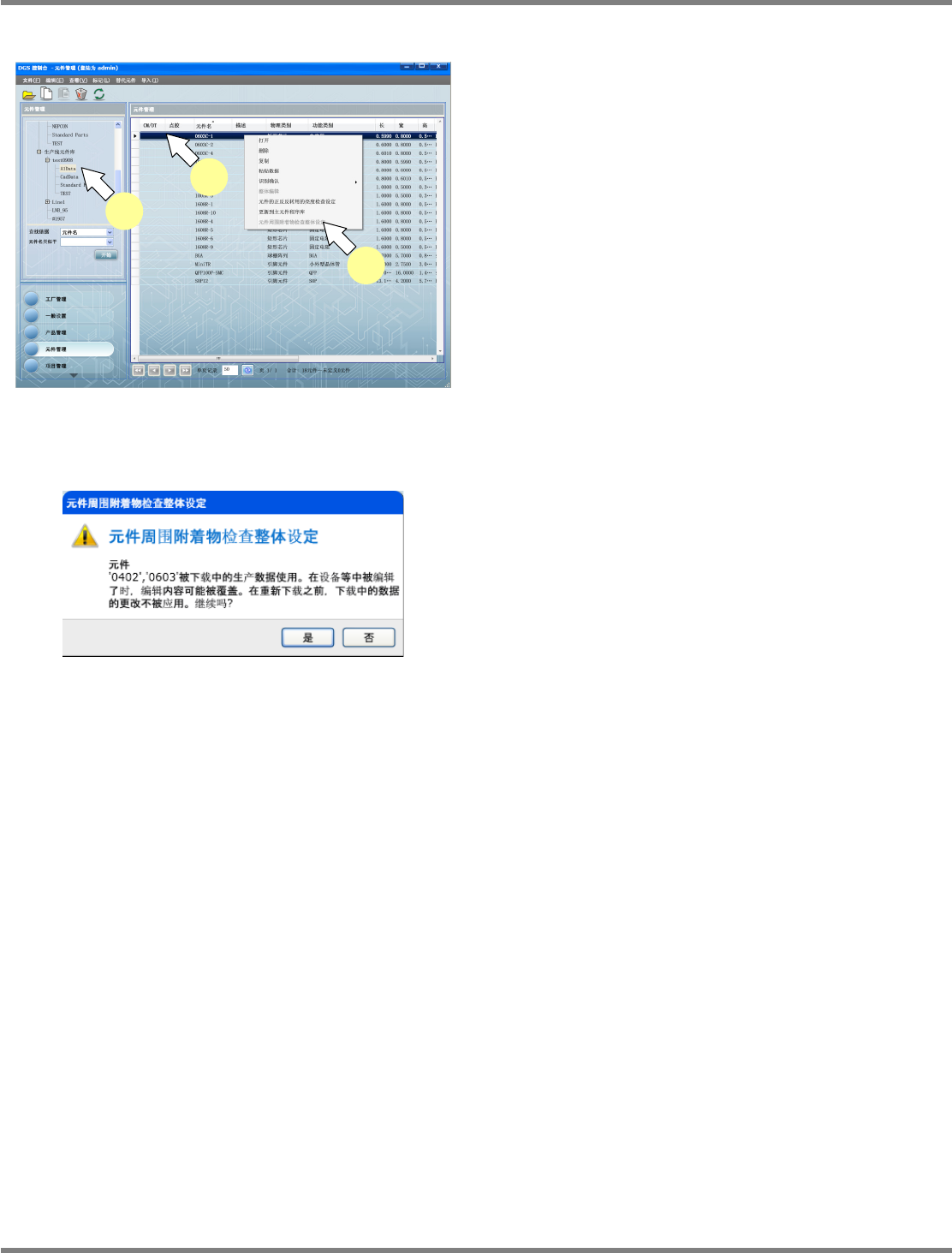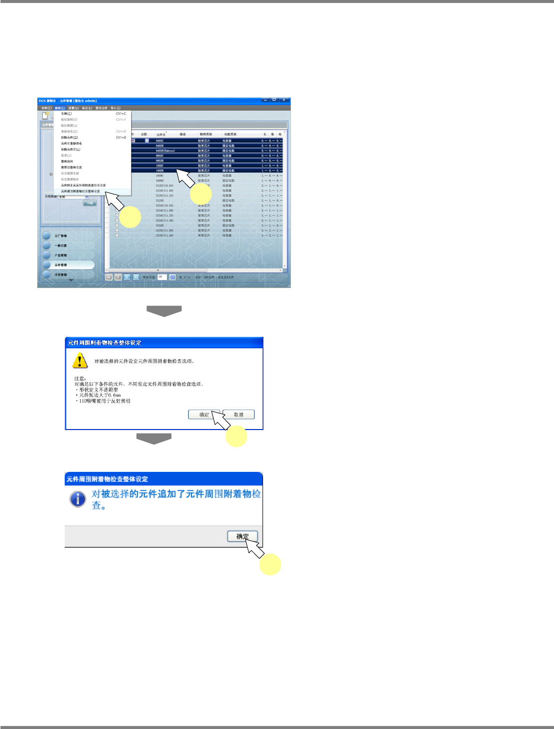 NPM-DGS 程序手册 6.7 现有元件的编辑 EJS9AC-MB-06P-02 Page 6-127 元件周围附着物检查整体设定 针对多个元件,对元件周围附着物检 查进行设定。 可在主元件库、生产线元件库双方进 行设定。 主元件库 1 选择进行元件周围附着物检查整体设 定的元件。 2 选择菜单栏的 [ 编辑 ] [ 元件周围附着 物检查整体设定 ] , 或者在选择的元件上 右击后选择右击菜单的 [ 元件周围附着 物检查整…