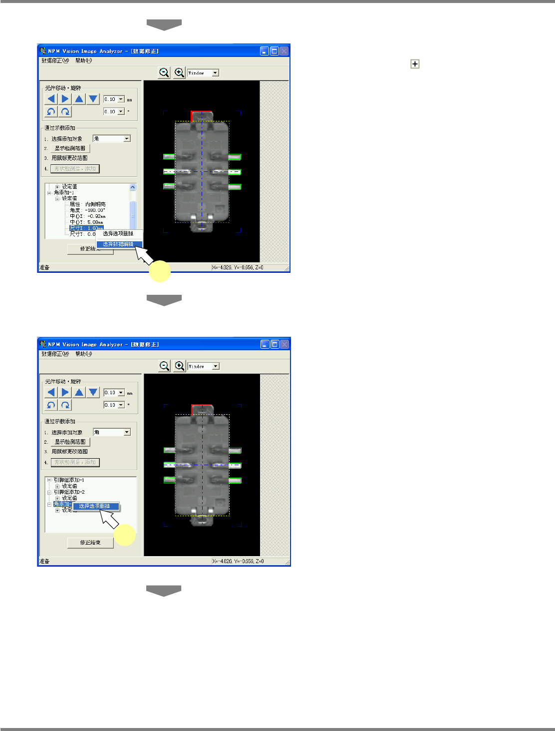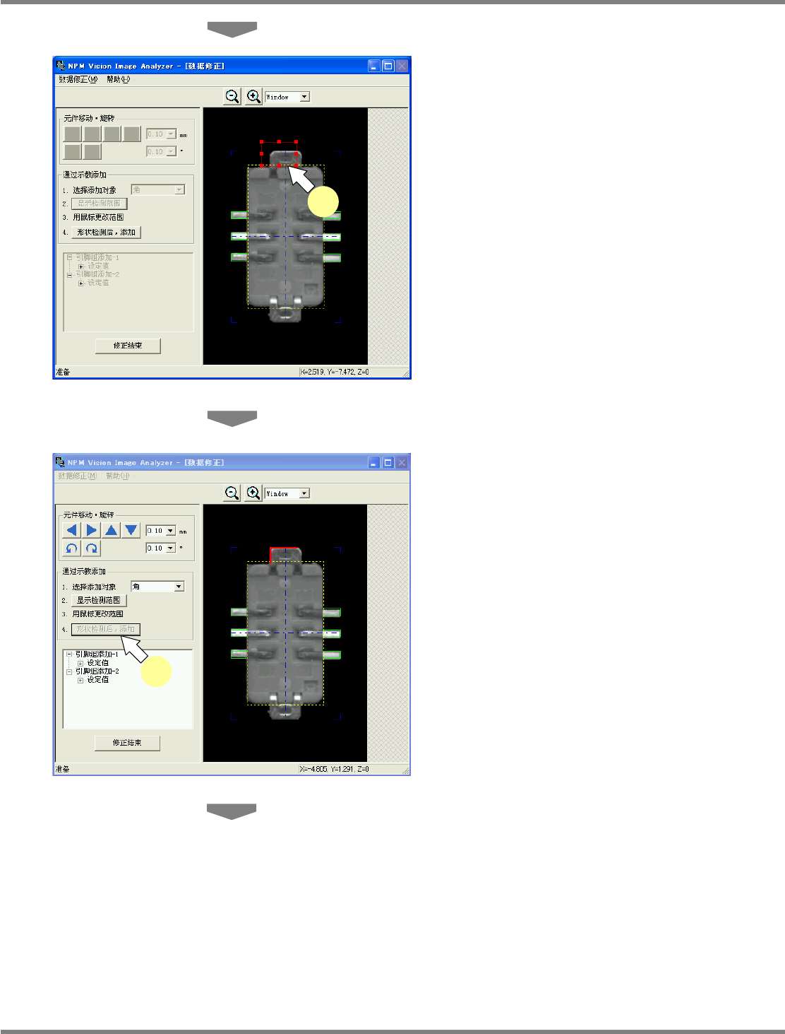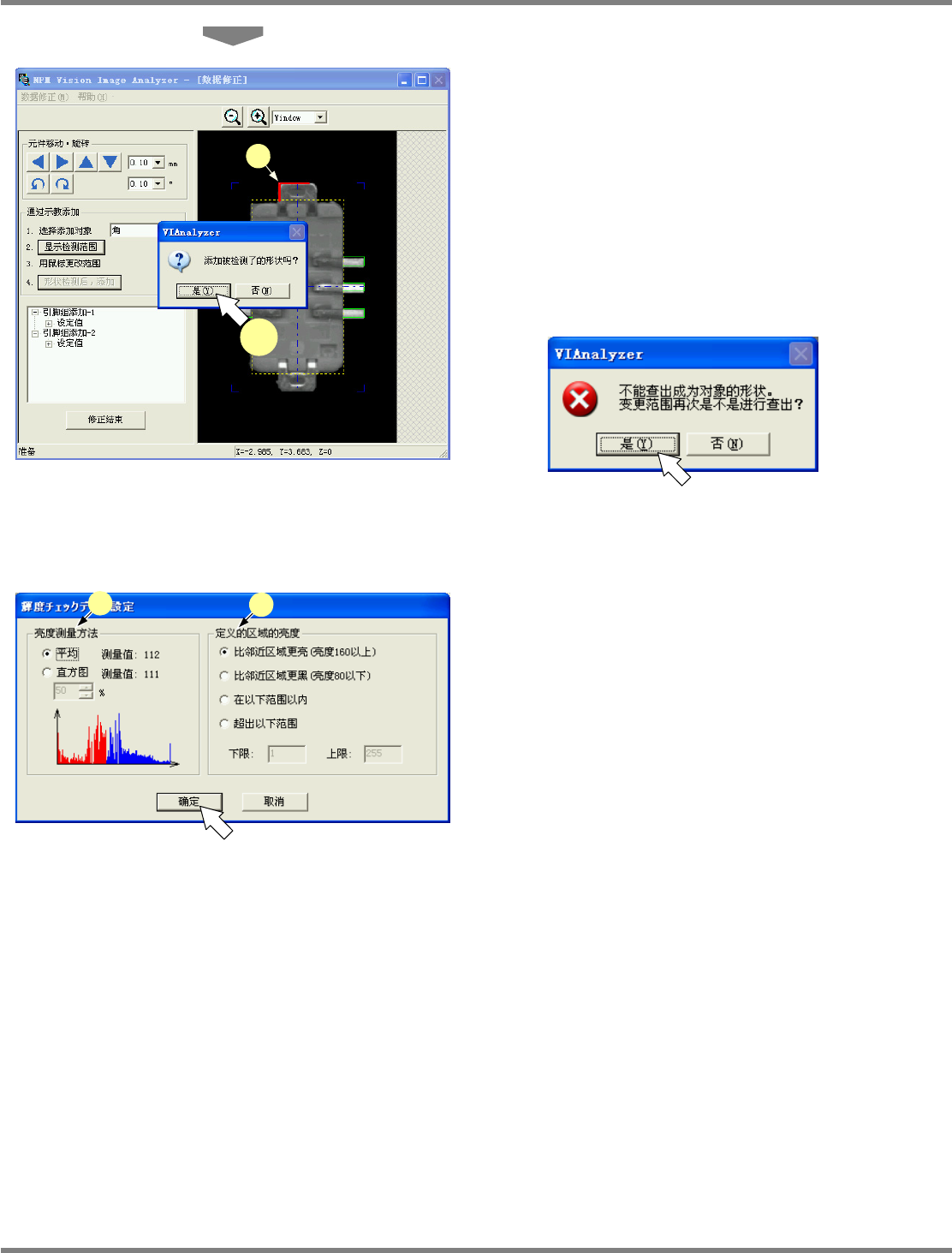 NPM-DGS 程序手册 6.9 使用设备识别错误图像执行识别测试 Page 6-142 EJS9AC-MB-06P-02 7 检测到添加对象时,将会显示信息窗 口。点击 [ 是 (Y)] 。 如果点击 [ 否 (N)] ,即会不添加而结束。 在元件图像上以红色线的 e. 形状图形显示添加 的形状。 如果没有检测到添加对象, 将会显示信息窗口。 请点击 [ 是 (Y)] 并重新调整检测范围。 需要对添加对象指定亮度检查时…