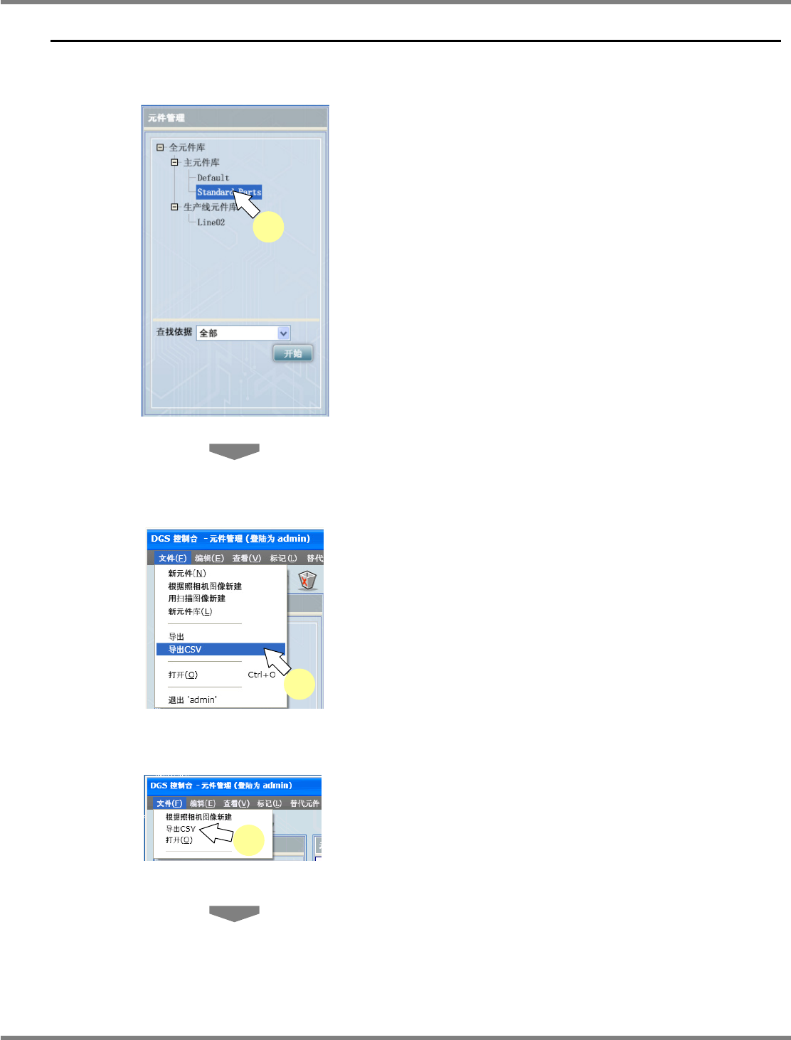 NPM-DGS 程序手册 6.10 导出 CSV EJS9AC-MB-06P-02 Page 6-145 6.10 导出 CSV 以 CSV 形式从元件库导出数据。 1 选择需要以 CSV 导出的元件库。 请从主元件库内或生产线元件库内选 择元件 库。 选择了主元件库时 2 选择菜单栏的 [ 文件 ] [ 导出 CSV] 。 将显示 < 另存为 > 画面。 选择了生产线元件库时 Parts061000…