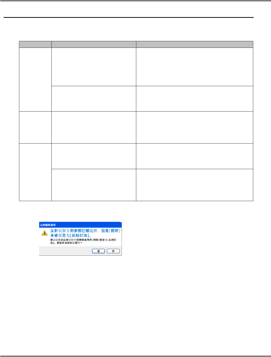 在元件编辑器下,当以不符合照明模式的设定保存时,将显示警告信息。当显示警告信息时,虽然