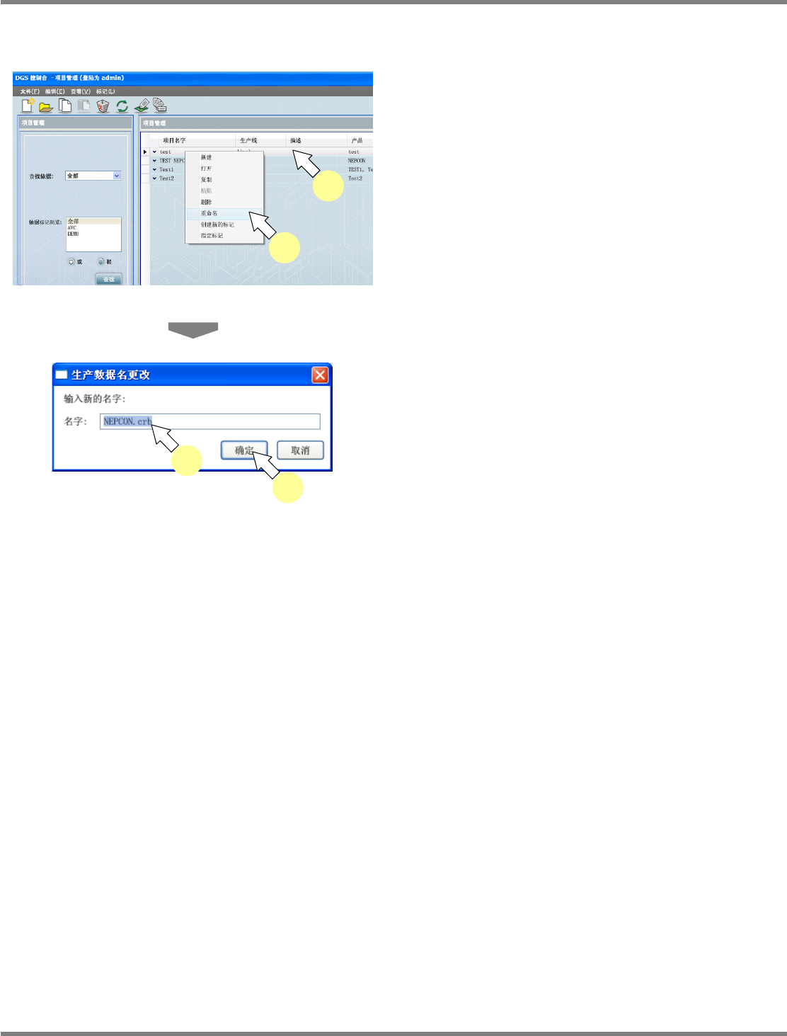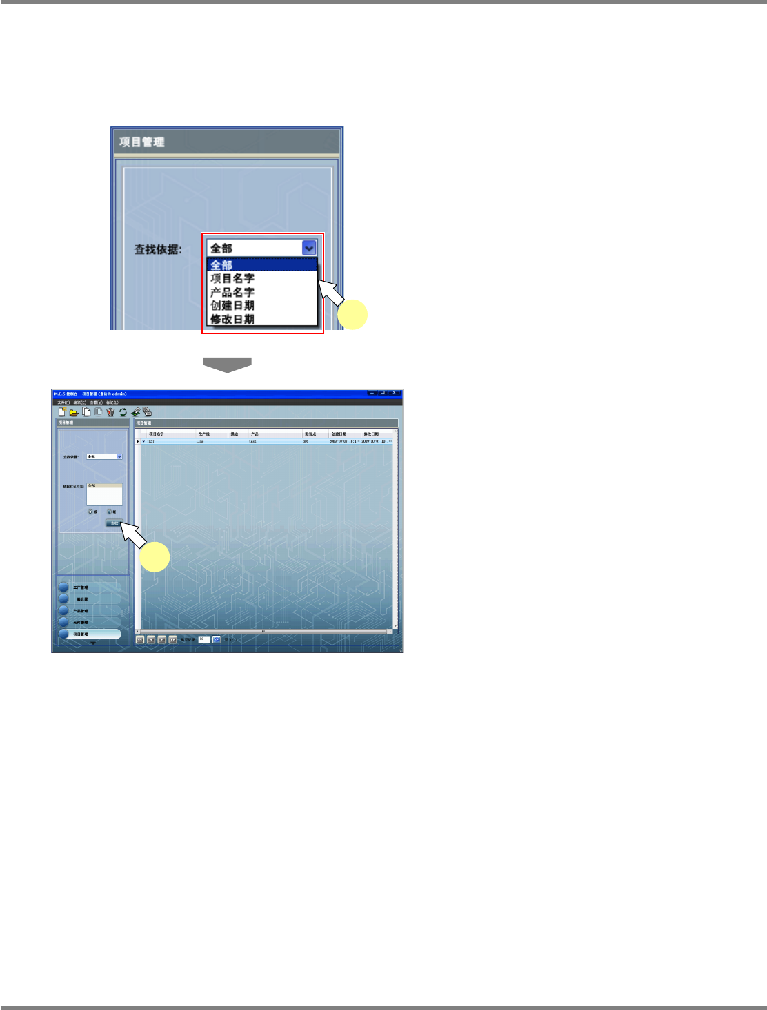 NPM-DGS 程序手册 7.1 概要 EJS9AC-MB-07P-03 Page 7-13 7.1.4 数据编制工作的搜索 搜索数据编制工作,并在数据编制工 作一览表中显示搜索到的数据编 制工作。 数据编制工作搜索方法 1 选择搜索方法。 选择的项目是 [ 全部 ] 、 [ 项目名字 ] 、 [ 产品名字 ] 、 [ 创建日期 ] 、 [ 修改日期 ] 。 2 点击 [ 查找 ] 。 在数据编制工作一览表中显示出搜索 到的…