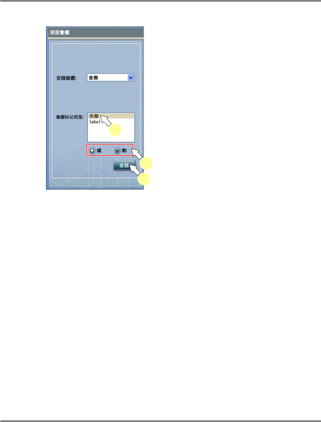 NPM-DGS 程序手册 7.1 概要 EJS9AC-MB-07P-03 Page 7-19 标签的搜索 1 选择 ‘ 依据标记浏览 ’ 栏的标签。 2 选择 ‘ 或 ’ 或者 ‘ 和 ’ 。 3 点击 [ 查找 ] 。 在元件一览表中显示出贴有所选标签 的元件。 Product070104S- 19C00 1 3 2