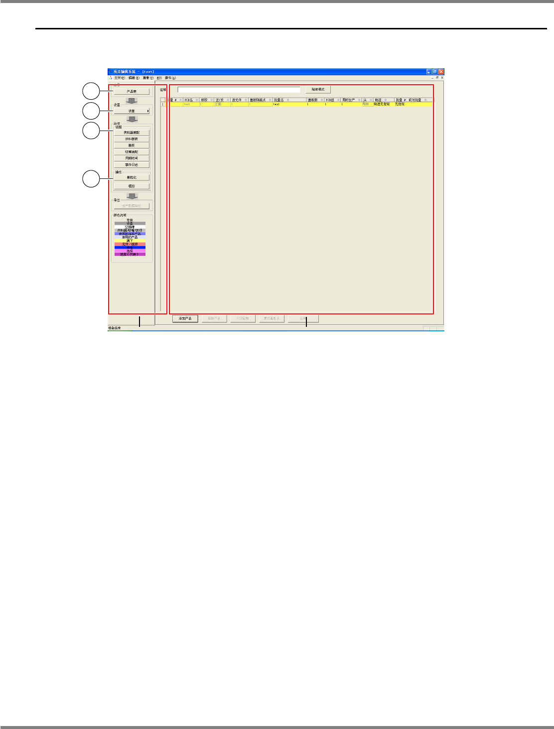 NPM-DGS 程序手册 7.2 项目编辑系统主画面 EJS9AC-MB-07P-03 Page 7-21 7.2 项目编辑系统主画面 项目编辑系统的主画面由画面左部项 目栏 ( 下图 A) 和各种视图画面 ( 下图 B) 构成。 在项目栏中进行视图画面的切换、各 种设定画面的显示、优化动作的 启动等操作。 ① ‘ 查看 ’ 切换画面右侧的显示。 [ 产品表 ] : 显示 PCB 一览表的画面。 ② ‘ 设置 ’ 启动编制数据所需的各种…