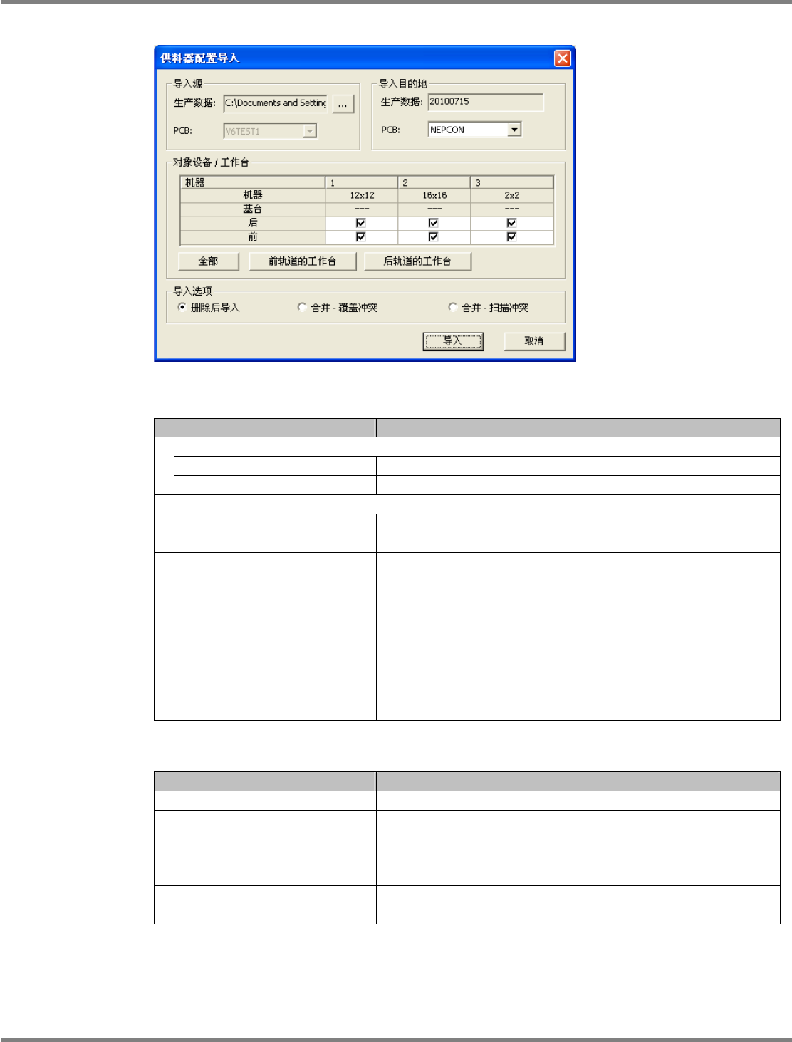 NPM-DGS 程序手册 7.2 项目编辑系统主画面 Page 7-42 EJS9AC-MB-07P-03 7.2.7 导入 可从原有的生产数据或者所导入的文 本文件中读取如下所示的数据。 如果采用本方式,数据生成会更简便 。 [ 供料器配置 ] [ 吸嘴装配 ] [ 机器设定 ] [ 分配条件 ] [ 点胶条件 ] [ 全部 ] 1 选择 [ 文件 ] [ 导入 ] [ 供料器配置 ] 。 显示出文件选择画面。 2 指定要…