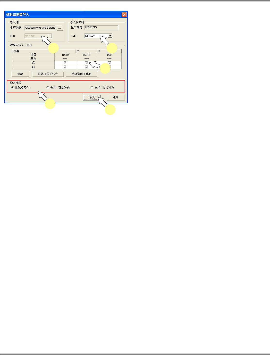 NPM-DGS 程序手册 7.2 项目编辑系统主画面 Page 7-44 EJS9AC-MB-07P-03 1 指定导入源的 PCB 。 2 指定导入目的地的 PCB 。 3 选择导入对象的设备。 请只在执行导入的工作台的复选框上 打勾。 4 选择导入选项。 5 点击 [ 导入 ] 。 Project070207S-0 3C00 1 2 3 4 5
