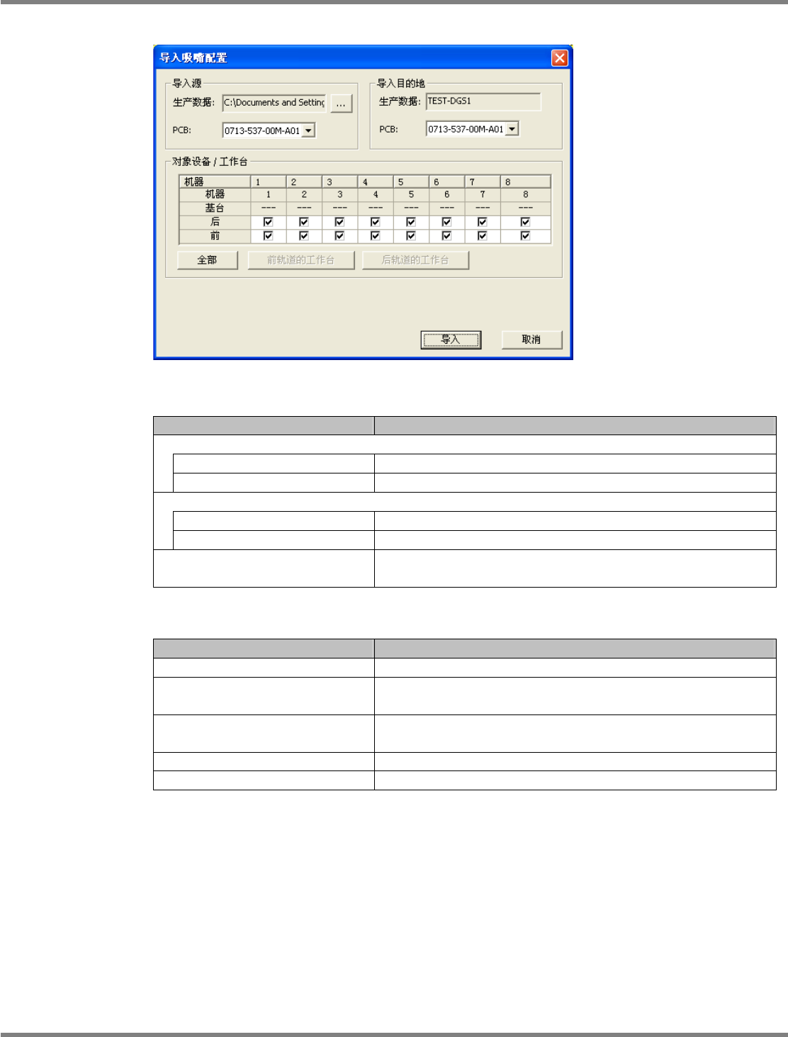 NPM-DGS 程序手册 7.2 项目编辑系统主画面 Page 7-46 EJS9AC-MB-07P-03 1 指定导入源的 PCB 。 2 指定导入目的地的 PCB 。 3 选择导入对象的设备。 请只在执行导入的工作台的复选框上 打勾。 4 点击 [ 导入 ] 。 Project070207S-0 2C00 1 2 3 4