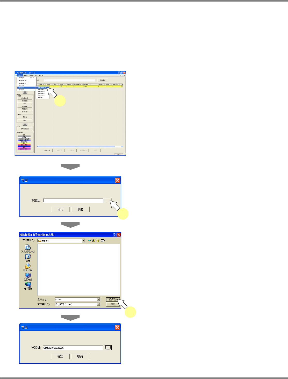 NPM-DGS 程序手册 7.2 项目编辑系统主画面 Page 7-48 EJS9AC-MB-07P-03 7.2.8 导出 将当前进行编辑的生产数据信息作为 文本文件,可输出下列数据。 [ 供料器配置 ] [ 吸嘴配置 ] [ 机器设定 ] [ 分配条件 ] [ 点胶条件 ] [ 全部 ] 1 选择 [ 文件 ] [ 导出 ] [ 供料器配置 ] 。 显示出输出目标选择画面。 2 点击 [ … ] ,指定文件夹。 显示…