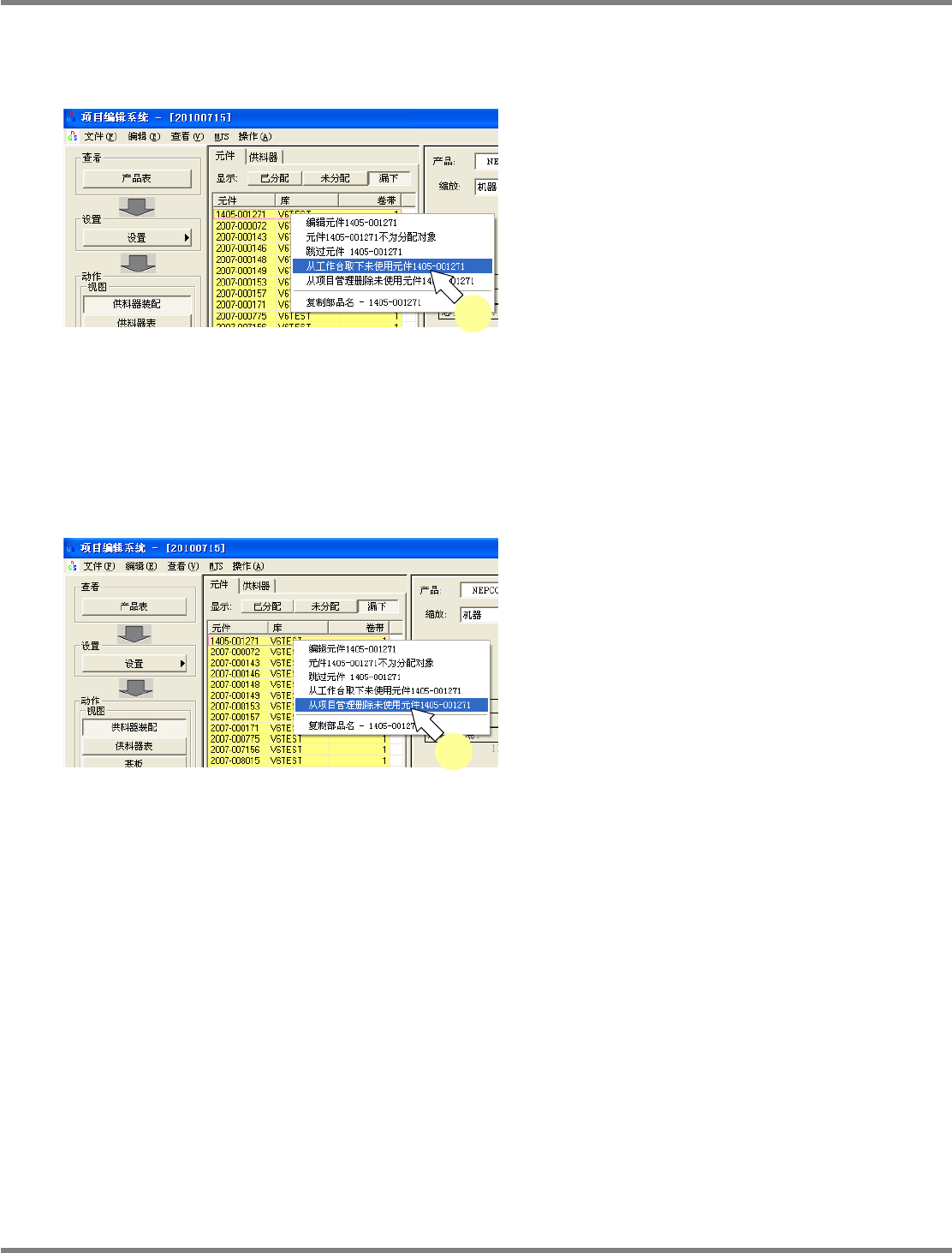 NPM-DGS 程序手册 7.4 供料器装配画面 EJS9AC-MB-07P-03 Page 7-75 从工作台上取下未使用元件 使用这项功能,能够将配置在供料器 上的全部未使用元件都从供料器 上取下来。 1 从供料器配置画面的元件一览中右点 击相应元件。 2 从右点击菜单中选择 [ 从工作台上取下 未使用元件 XXXX] 。 所选择的未使用元件将会被全部从供 料器上取 下来。 从项目管理删除未使用元件 使用这项功能, 能够…