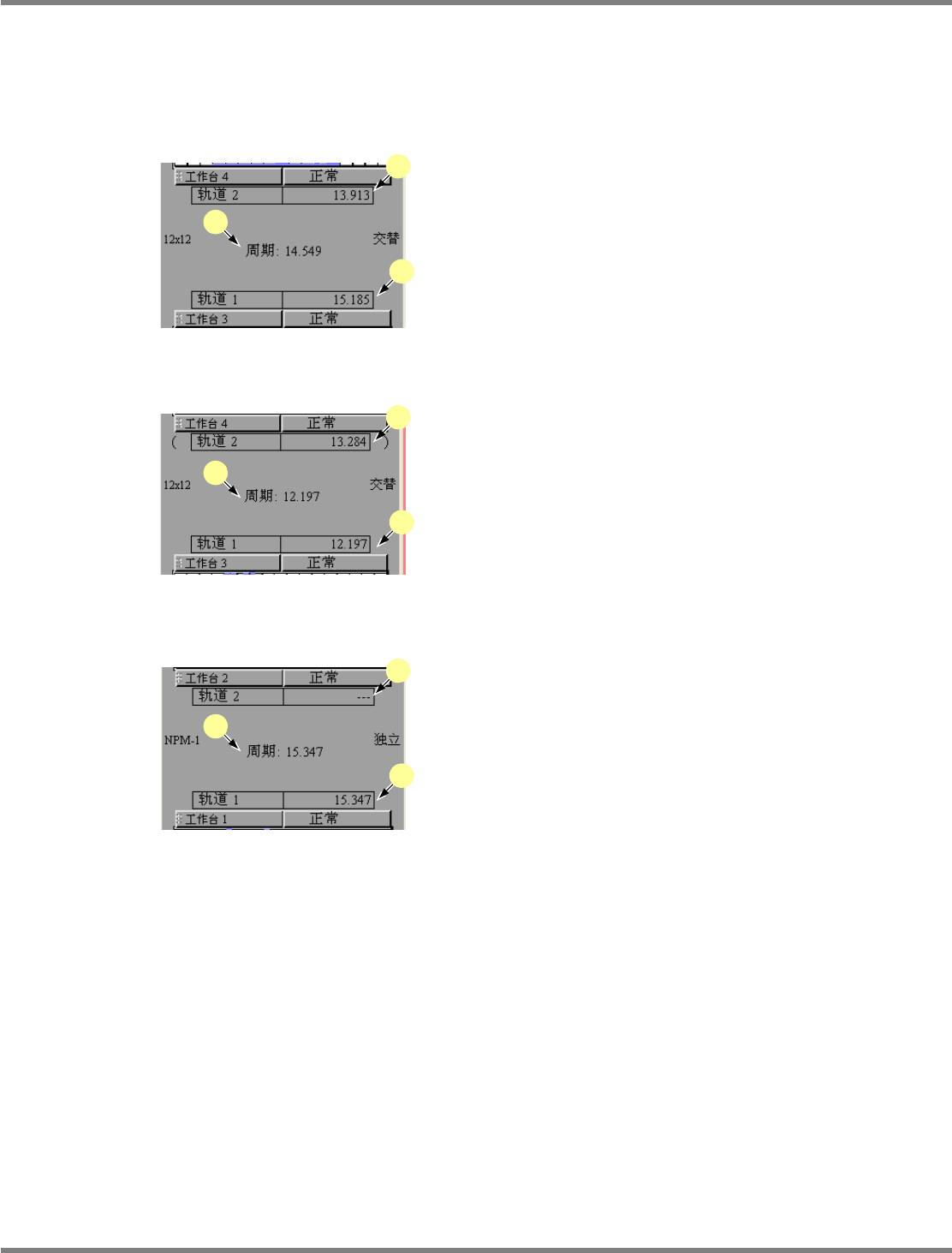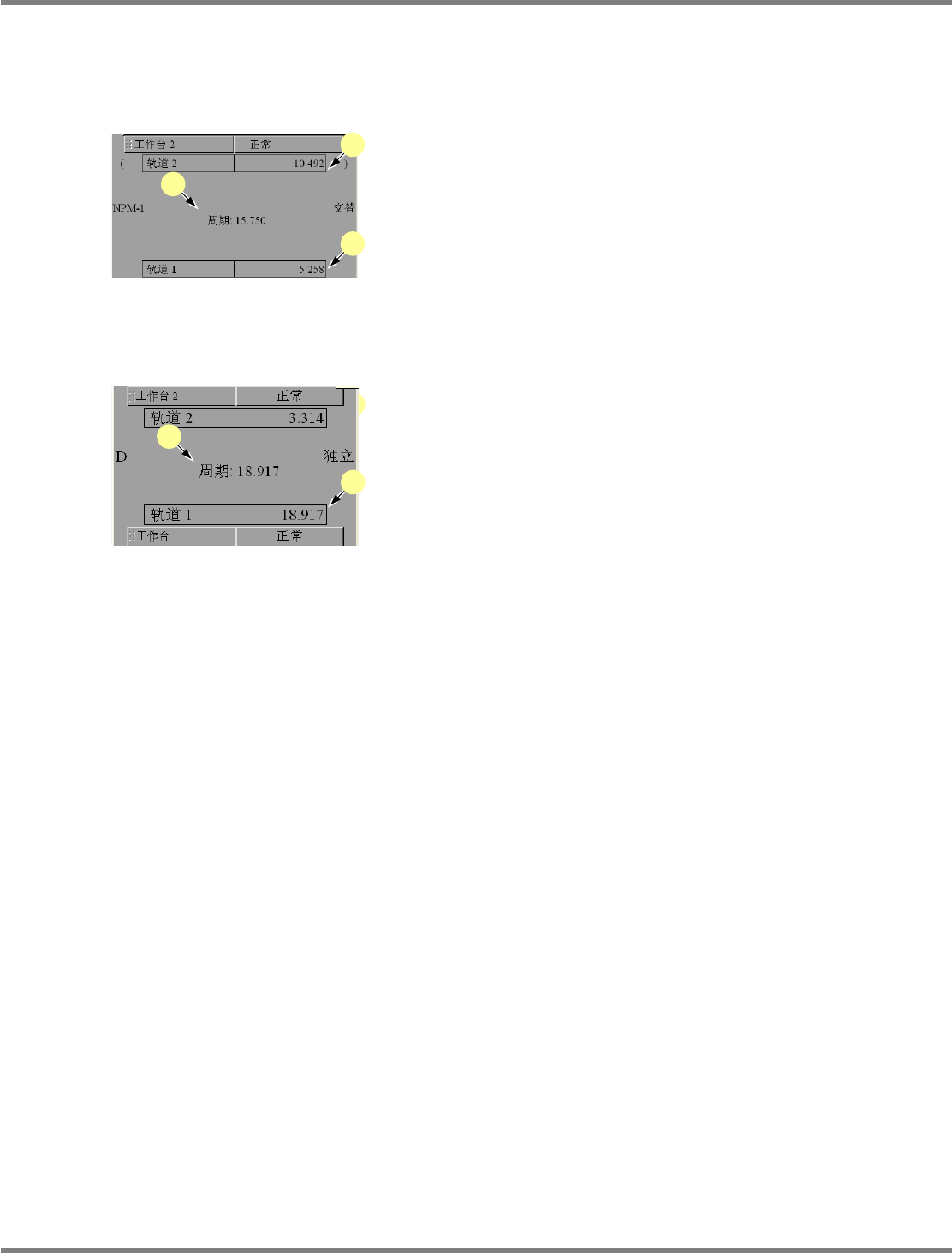 NPM-DGS 程序手册 7.4 供料器装配画面 EJS9AC-MB-07P-03 Page 7-83 在双轨上显示周期 在双轨上,显示每个轨道的周期,以 及每个机器的周期。 显示方法因实装模式、轨道指定而有 所不同。 ① 交替 : 没有指定轨道时 a : 显示各个轨道上的周期。 b : 在两个轨道上生产时,将作为机器周 期而显 示周期的平均。 ② 交替 : 指定了轨道 1 、轨道 2 时 a : 显示各个轨道的周期。没有在轨道指定…