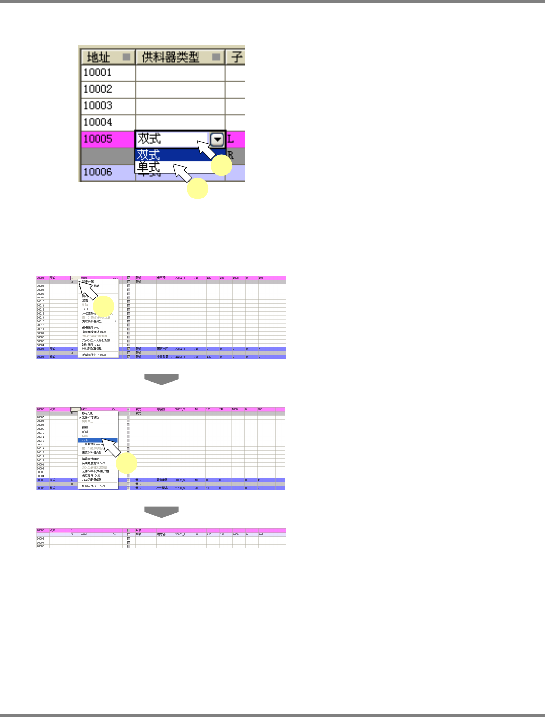 NPM-DGS 程序手册 7.6 供料器表画面 EJS9AC-MB-07P-03 Page 7-93 7.6.3 供料器类型的变更 1 点击要变更的供料器的供料器类型。 供料器类型栏里显示出一览表。 2 在供料器类型的一览表中进行选择。 变更供料器类型。 无法变更固定的元件供料器。需要变 更时,请 解除固定。 7.6.4 更换供料器的子插槽 ( 双插槽 ) 1 右击要更换的子插槽。 显示出右击菜单的 [->L] 或…