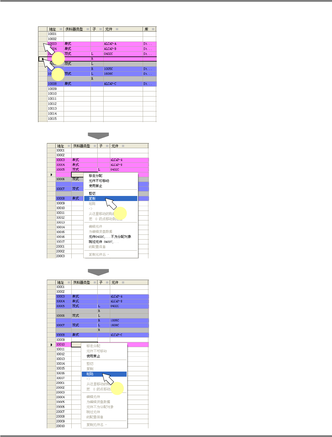 NPM-DGS 程序手册 7.6 供料器表画面 Page 7-96 EJS9AC-MB-07P-03 7.6.6 供料器表中删除元件 1 选择要拆下的元件。 2 在右击菜单中点击 [ 移走分配 ] 。 删除所选的元件。 Product070506S- 01C02 1 2