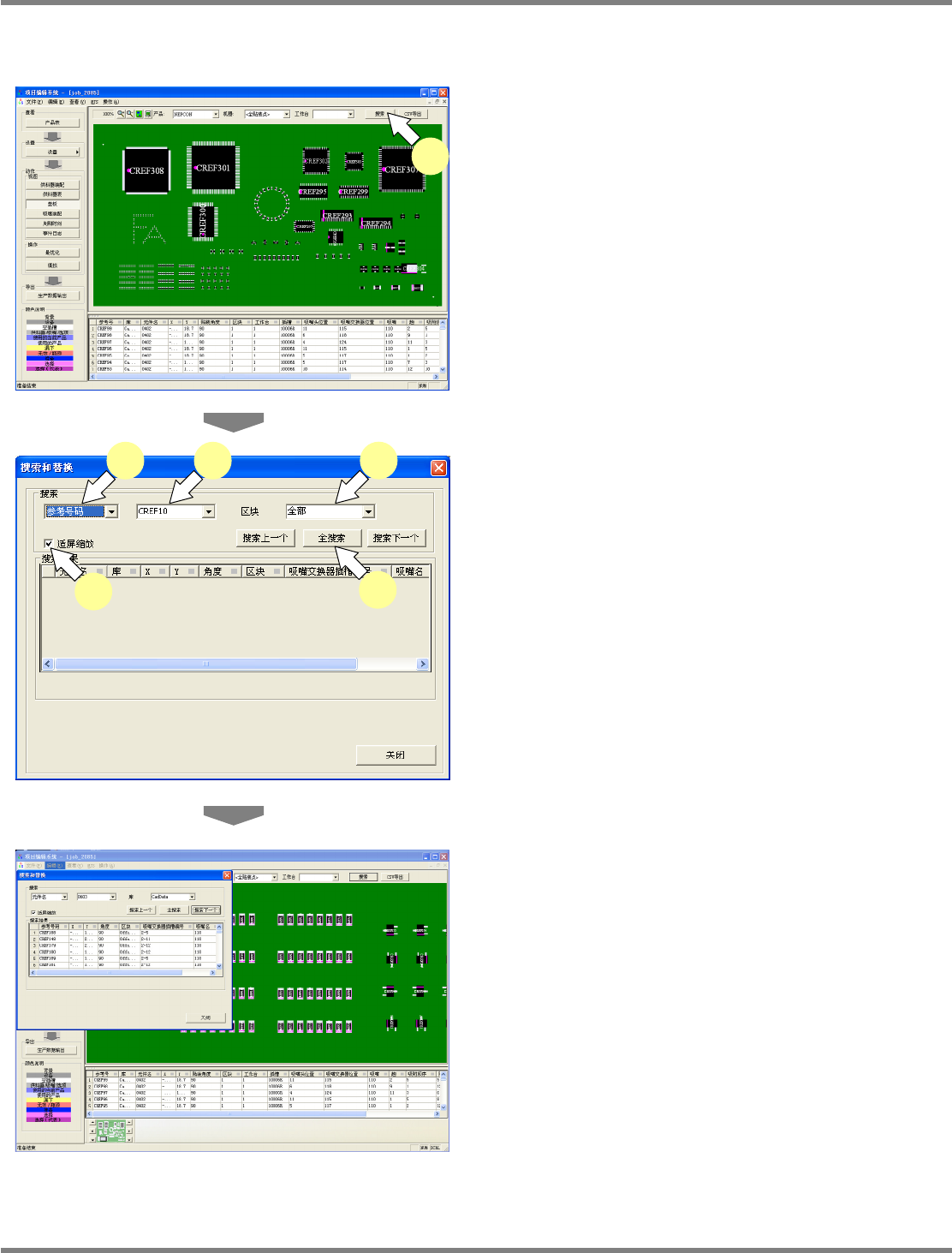 NPM-DGS 程序手册 7.7 基板画面 Page 7-108 EJS9AC-MB-07P-03 元件搜索方法 1 点击 [ 搜索 ] 。 显示 < 搜索和置换 > 画面。 2 从下拉菜单中选择下述搜索项目。 • ‘ 参考号码 ’ • ‘ 元件名 ’ • ‘ 插槽位置 ’ • ‘ 吸嘴位置 ’ 3 通过下拉菜单选择执行搜索的元件。 能够选择的元件与在画面显示控制部 所设定的 ‘ 设别 ’ 和 ‘ 工作台 ’ 相…