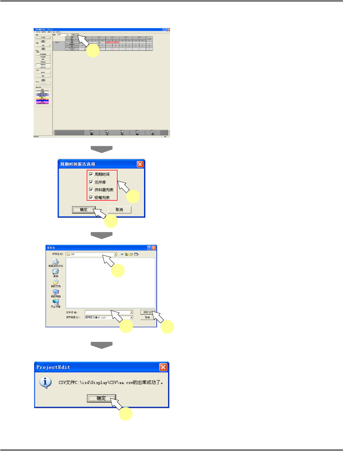 NPM-DGS 程序手册 7.9 周期时间画面 EJS9AC-MB-07P-03 Page 7-121 导出 CSV 1 点击 [ 导出 CSV] 。 将显示 < 周期时间报告选项 > 画面。 2 选择导出内容。 3 点击 [OK] 。 4 指定保存 CSV 文件的文件夹。 5 输入 CSV 文件名。 6 点击 [ 保存 ] 。 7 点击 [ 确定 ] 。 即完成了 CSV 文件的导出。 Product07090…
