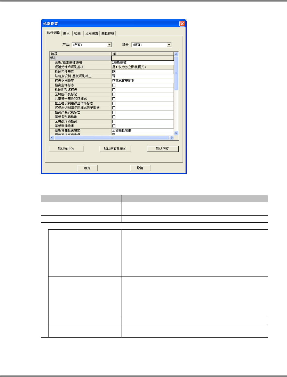 NPM-DGS 程序手册 7.11 各种设定 EJS9AC-MB-07P-03 Page 7-139 项目 说明 ‘ 标记识别顺序 ’ 设定标志的识别顺序。有以下 2 种。 • [ 识别标志在坏标志前 ] • [ 坏标志在识别标志前 ] ‘ 代表不良标记检测 ’ 设定是否检测代表不良标记。 ‘ 图形不良标记检测 ’ 设定是否检测图形不良标记。 ‘ 图形组不良标记检测 ’ 设定是否对图形组进行检测。 ‘ 第一识别标记和不良标记共享 ’ 设…