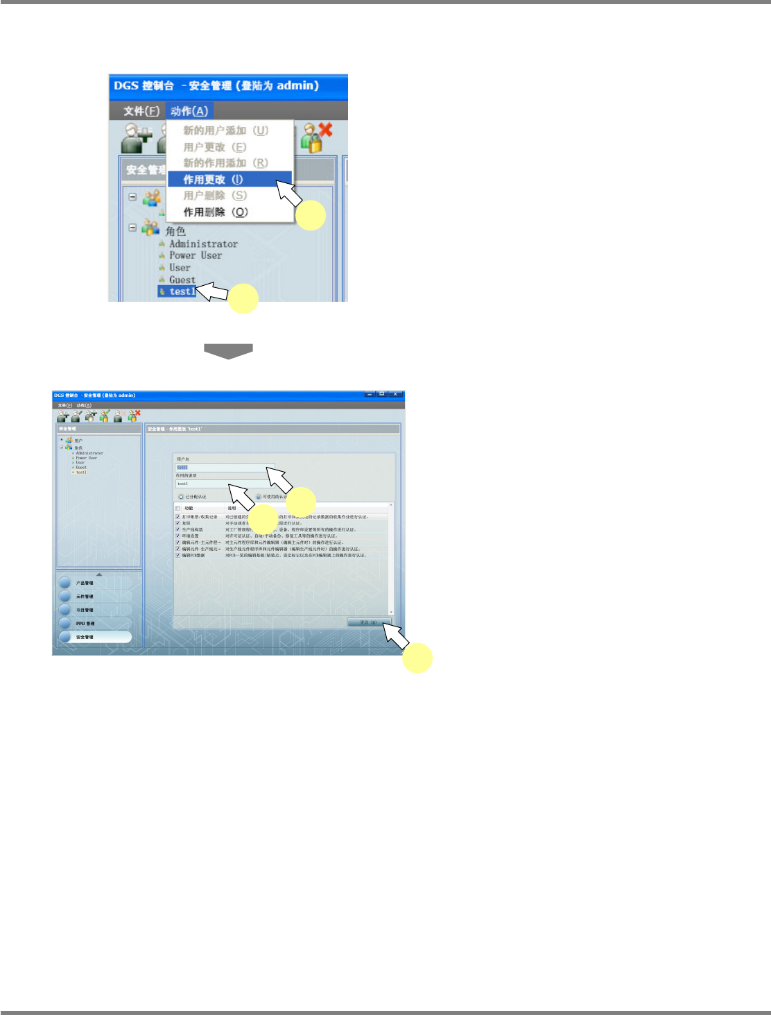 NPM-DGS 程序手册 8.1 许可证管理 EJS9AC-MB-08P-01 Page 8-5 8.1.2 作用的更改 作用名称、说明的更改 1 从树形区域中选择需要更改的作用。 2 选择菜单栏的 [ 动作 ] [ 作用更改 ] ,或 在树形区域的 ‘ 作用 ’ 上右击,从右击菜 单中选择 [ 作用更改 ] 。 显示在信息显示区域上的作用信息转 为可编辑 状态。 3 在文本框中输入作用名称与说明。 不能使用与默认作用相…