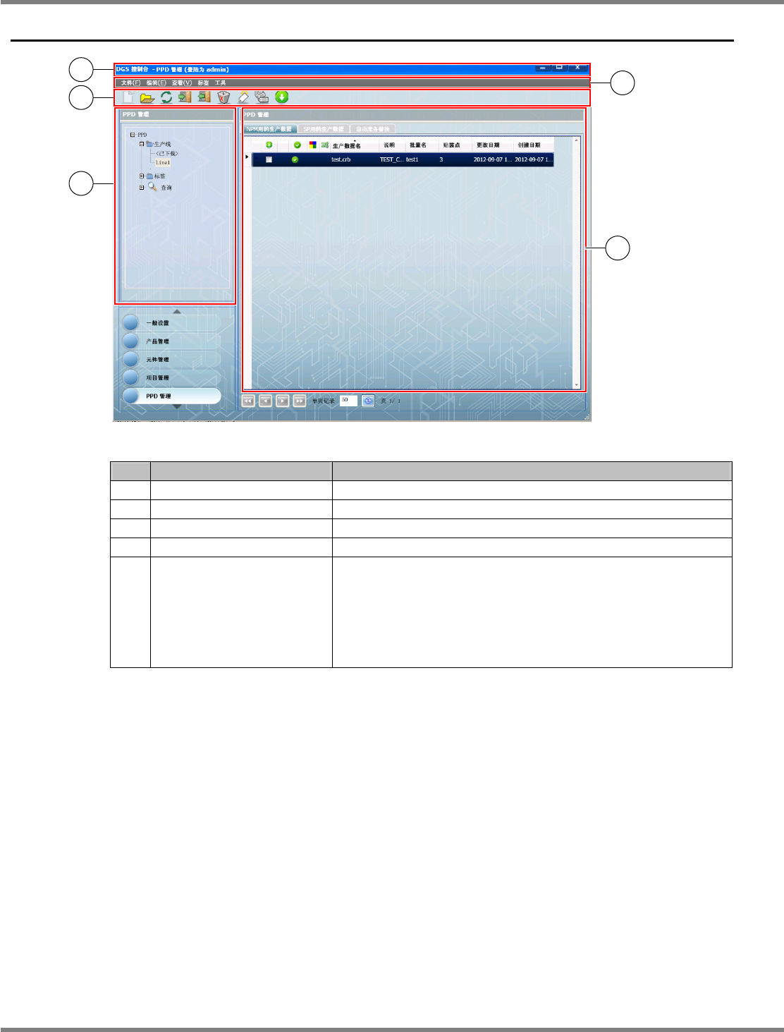NPM-DGS 程序手册 9.2 关于 PPD 管理画面 Page 9-4 EJS9AC-MB-09P-02 9.2 关于 PPD 管理画面 No. 名称 说明 标题栏 显示版本信息、注册用户名、使用中 的应用程序软件名。 菜单栏 显示文件、编辑、显示的菜单栏。 数据操作区域 进行生产数据的操作。 导航区域 对生产数据进行搜索、删除。显示每 个生产线的文件夹的阶层。 信息显示区域 显示所搜索到的生产数据一览表。初…