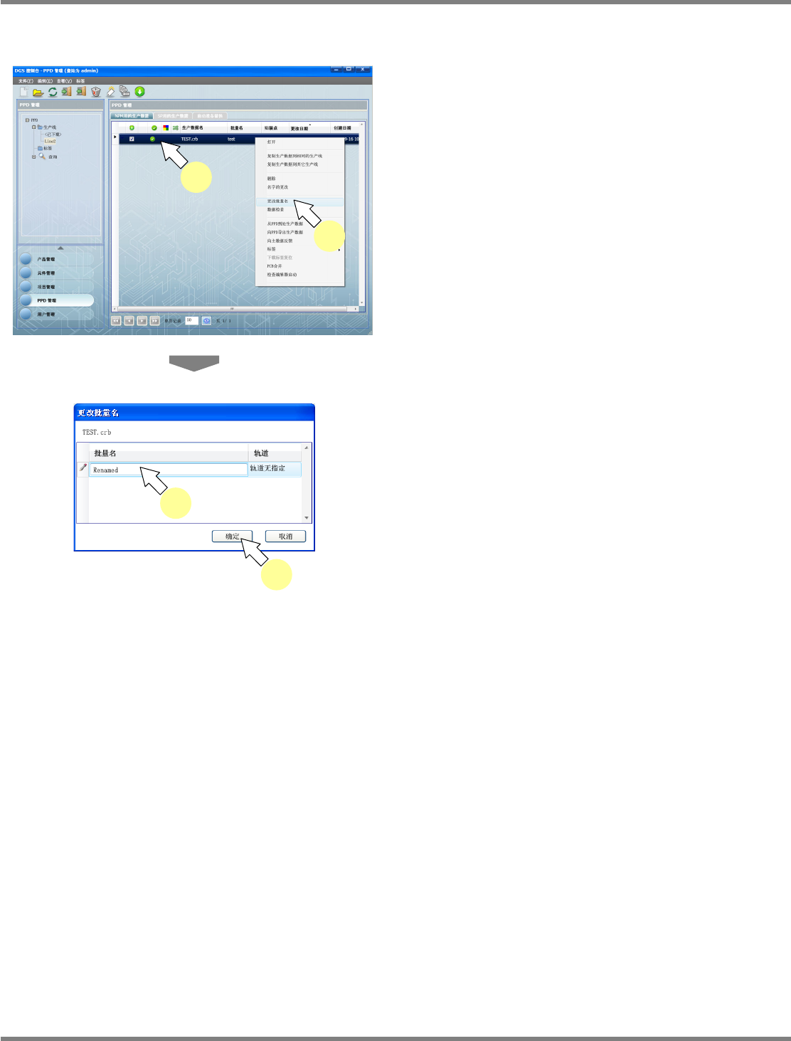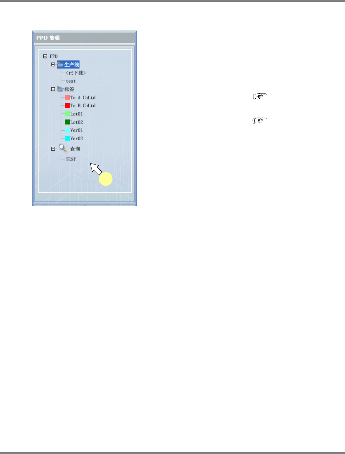 NPM-DGS 程序手册 9.2 关于 PPD 管理画面 EJS9AC-MB-09P-02 Page 9-15 9.2.9 生产数据显示过滤器 在此,设定是否在设备的 < 准备 – 文件操作 > 画面上显示生产数据以及使用中的 批量。 1 选择显示在设备上的生产数据。 2 点击 ,打开生产数据的批量。 将显示生产数据中的批量一览。 3 勾选批量的复选框。 将会在设备上显示所勾选的批量与生 产数据。 不可选择多个纪…