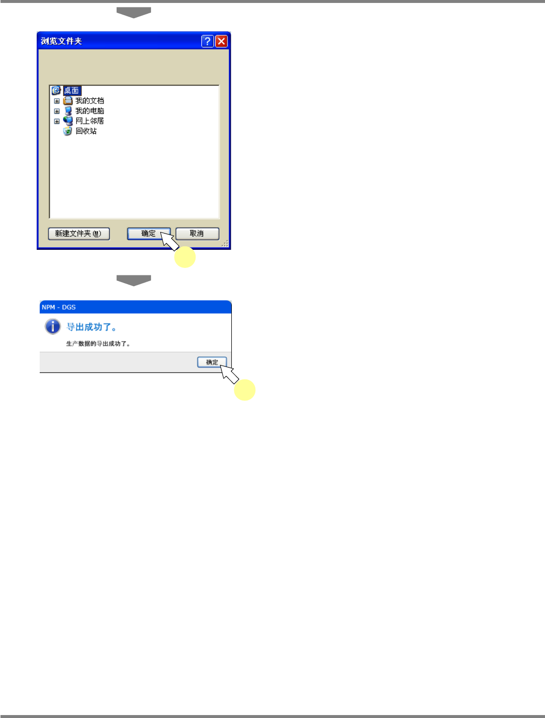 NPM-DGS 程序手册 9.3 生产数据的操作 EJS9AC-MB-09P-02 Page 9-27 9.3.3 生产数据的导出 1 选择要编辑的生产数据。 2 选择菜单栏的 [ 文件 ] [ 导出 ] ,或者点 击工具栏的 , 或者选择右击菜单的 [ 向 PPD 导出生产数据 ] 。 显示出 < 文件夹参照 > 画面。 3 选择要指定的导出地点,点击 [ 确定 ] 。 PPD090401S-01C 06 1 PP…