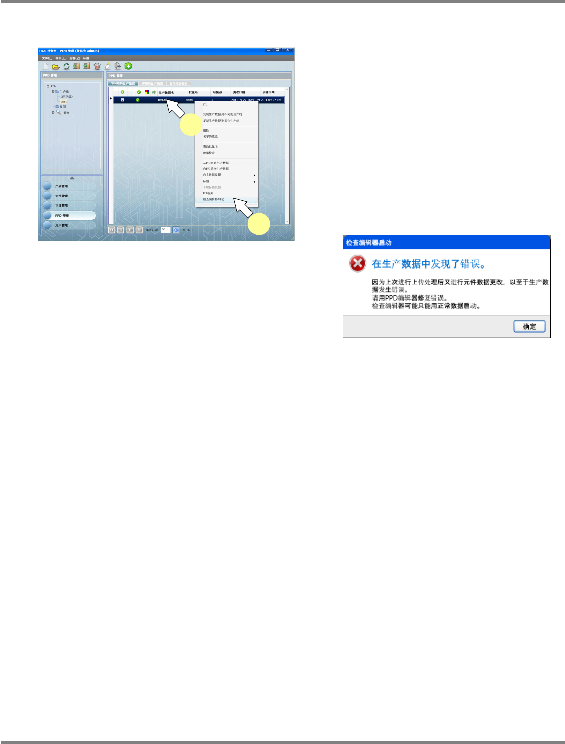 NPM-DGS 程序手册 9.3 生产数据的操作 EJS9AC-MB-09P-02 Page 9-35 9.3.7 检查编辑器的启动 1 选择要编辑的生产数据。 2 在所选的生产数据上右击弹出菜单, 选 择 [ 检查编辑器启动 ] 。 显示出 < 检查编辑器 > 画面。 检查编辑器可在没有数据检查错误时 启动。如 果存在错误,将显示下述的警告信息 。请通过 PPD 编辑器进行修复,并在承诺后 重新启动检 查编辑器。 …