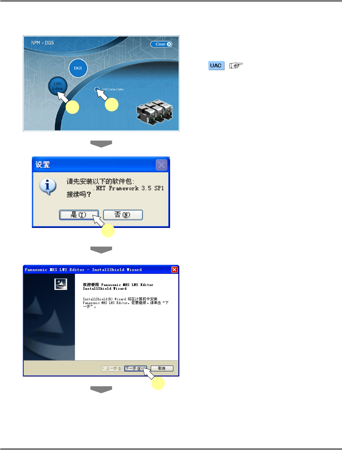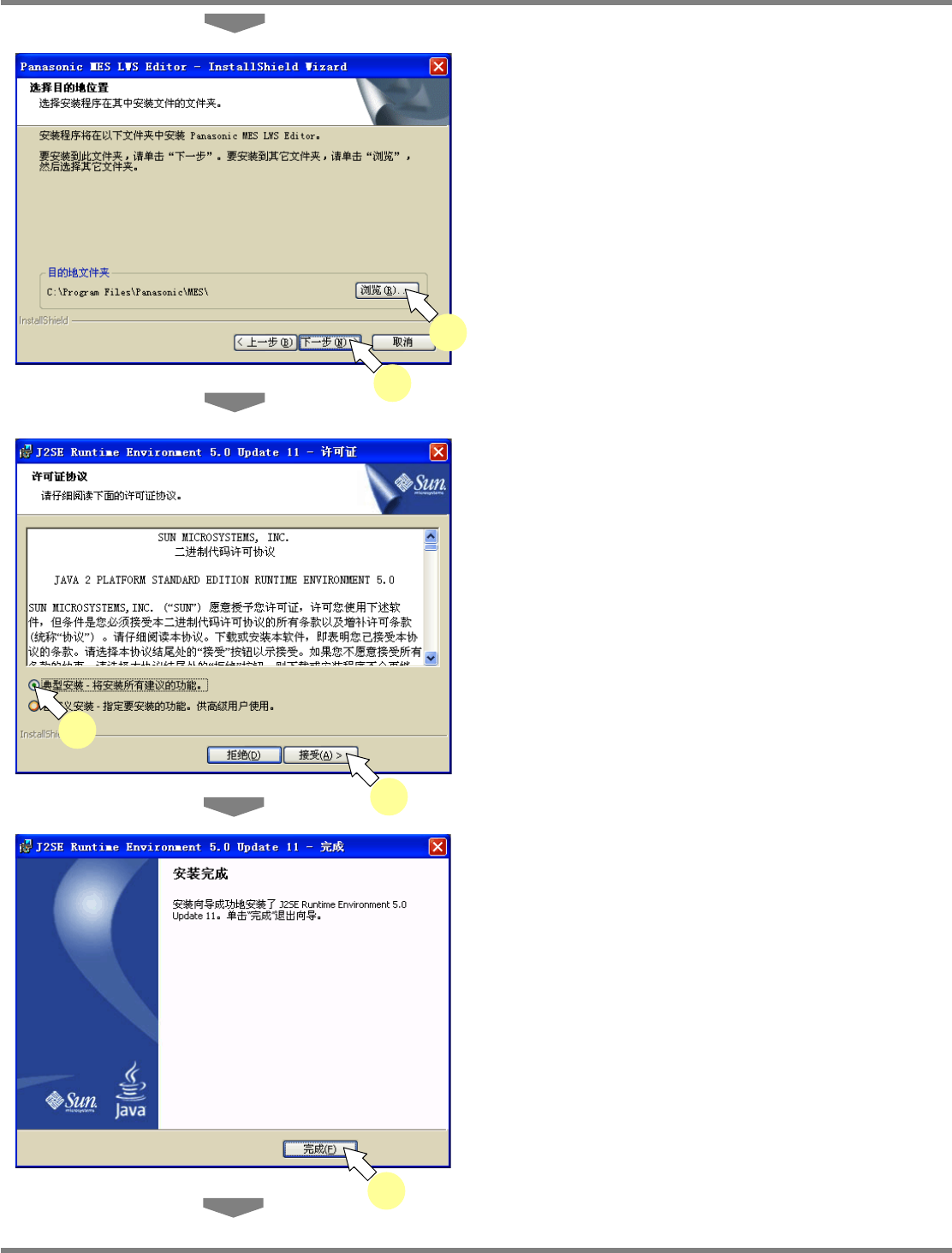 NPM-DGS 程序手册 2.2 NPM-DGS 的安装 Page 2-50 EJS9AC-MB-02P-01 4 需要变更安装目的地时,点击 [ 浏览 …] 选择文件夹。 通常无需变更。 5 点击 [ 下一步 ] 。 6 选定 ‘ 典型安装 ’ ,点击 [ 接受 ] 。 如果已安装了 ‘J2SE Runtime Environment 5.0 Update 11’ ,请进行步骤 8. 。 7 点击 [ 完成 ] 。 Insta…