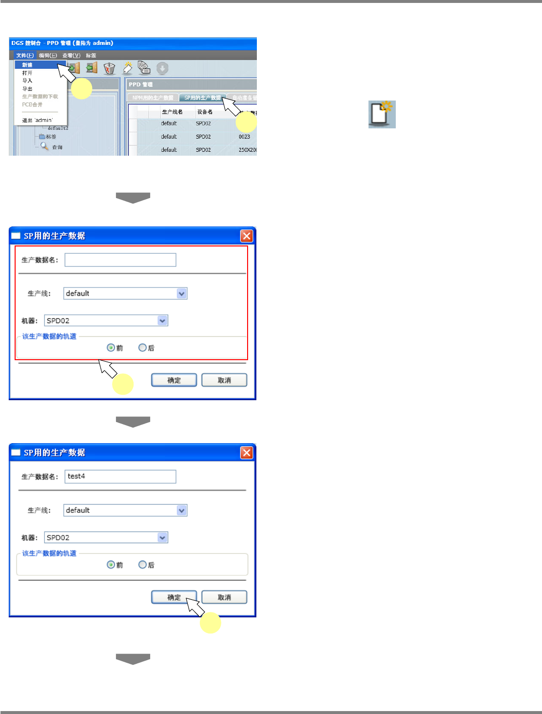 NPM-DGS 程序手册 9.3 生产数据的操作 EJS9AC-MB-09P-02 Page 9-59 显示项目 项目 说明 SP 生产数据画面 ‘ 生产线名 ’ 显示生产线名称。 ‘ 设备名 ’ 显示设备名称。 ‘ 生产数据名 ’ 显示生产数据名称。 ‘ 前 / 后 ’ 显示前侧或后侧的某一方。 ‘ 快捷方式对象 ’ 如果属于快捷方式数据,将显示快捷 方式的链接。 ‘ 刷新日期 ’ 显示生产数据的刷新日期。 ‘ 创建日期 ’ 显示…