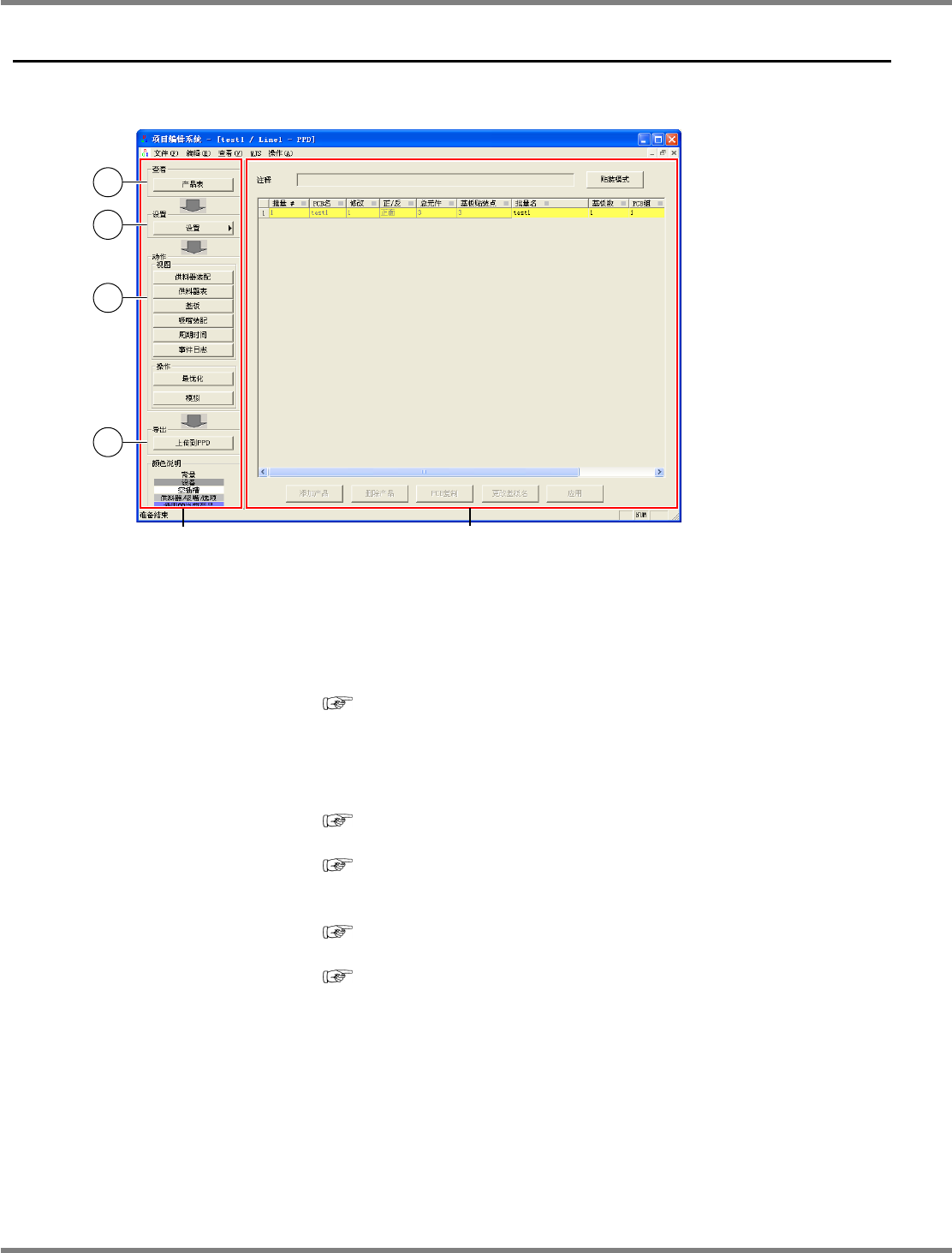 NPM-DGS 程序手册 9.4 关于项目编辑系统画面 Page 9-72 EJS9AC-MB-09P-02 9.4 关于项目编辑系统画面 项目编辑系统的主画面由画面左方的 项目栏 ( 下图 A) 和各种视图画面 ( 下图 B) 构成。 通过项目栏进行的作业如下 : 视图画面的切换、 各种设定画面的显示、 模拟、 最优化、 上传 到 PPD 。 ① ‘ 查看 ’ 切换画面右侧的显示。 [ 产品表 ] : 显示 PCB 一览表的画面。 ‘…