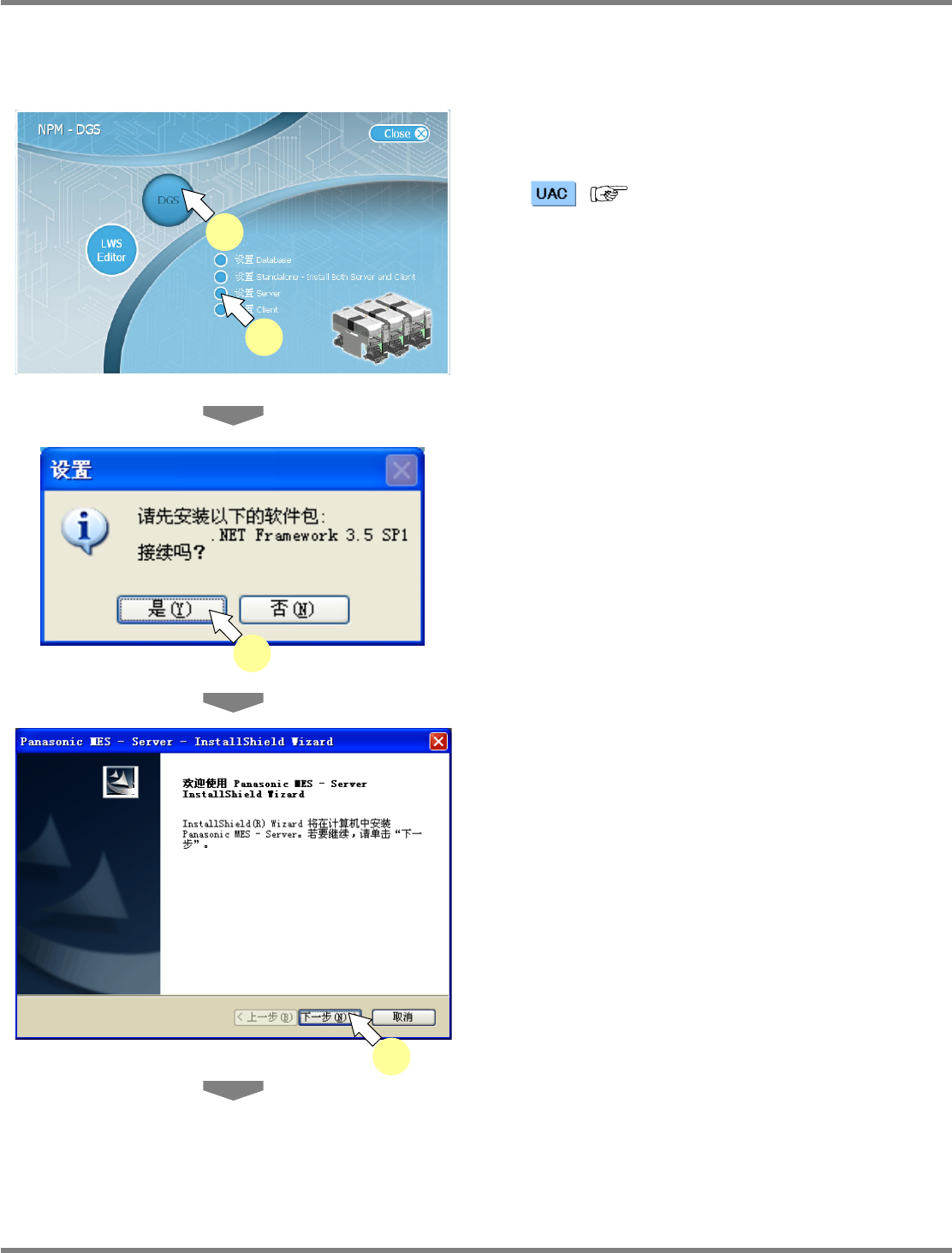 NPM-DGS 程序手册 2.2 NPM-DGS 的安装 Page 2-40 EJS9AC-MB-02P-01 分别安装 DGS 客户端、数据库,服务器的功能时 ① 安装服务器时 1 在放入 CD-ROM 后自动再生的画面上 选择 ‘DGS’ 的 ‘ 设置 Server’ 。 ( ‘1.3.1 关于用户帐户控制 ’) 2 点击 [ 是 ] 。 当 NET 的版本在 3.5 以下时,显示这个窗口。 点击 [ 是 ] ,将会执行…