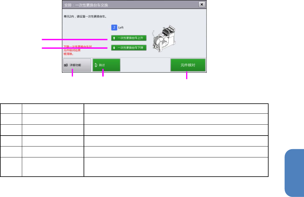 触摸[安排:一次性更换台车交换]对话框的[元件核对]后,一次性更换台车会下降,显示[安排:核对