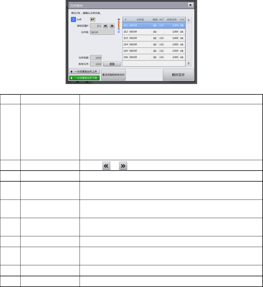 (j) 核对完毕 确认一次性更换台车上升后,完成元件核对作业,关闭对话框。