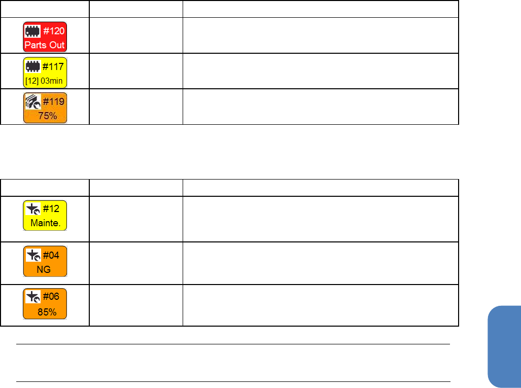 第 4 章 操作篇 4- 3. 生产 45 4 供给部相关的错误,警告 供给部发生错误 ,警告时,将 显示以下图标 。 显示 状态 说明 无元件 错误 显示发生 无元件 的供给位 置编号。 无元件 警告 显示预测 可能发生 无元件 的供给位 置编号和 剩余的 基板预定块 数,预 定时间。 吸取率 降低警告 显 示低于各 元件所设 定吸取率 的带式供 料器供给 位置编号 和实际 吸取率 。 贴片头,吸嘴相关的错误,警告 贴片头,吸…