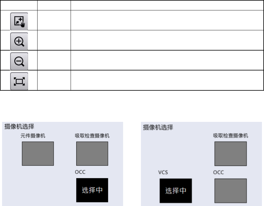 第 4 章 操作篇 4- 3. 生产 48 选中摄像机的操作 通过 摄像机 图像右下方 的按钮,可进 行以下操作。 按钮 名称 说明 拖动模式 触摸后,光标将 切换为手形, 可触摸显示框 内的图像后 拖动。 再次触摸,解除 拖动模式。 放大模式 触摸后,光标将 切换为加号形 状,可触摸显 示框内的图 像后放大。 再次触摸,解除 放大模式。 缩小模式 触摸后,光标将 切换为减号形 状,可触摸显 示框内的图 像后缩小。 再次触摸,解除 …